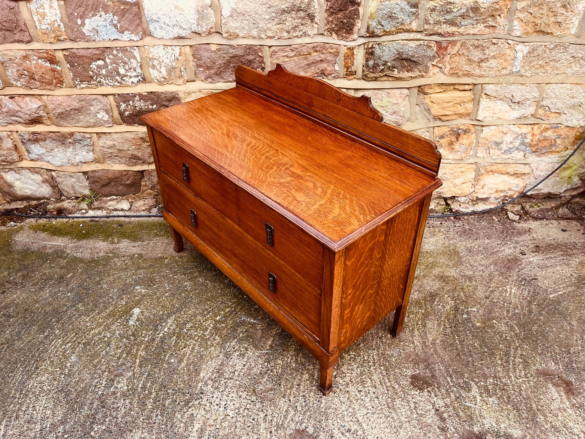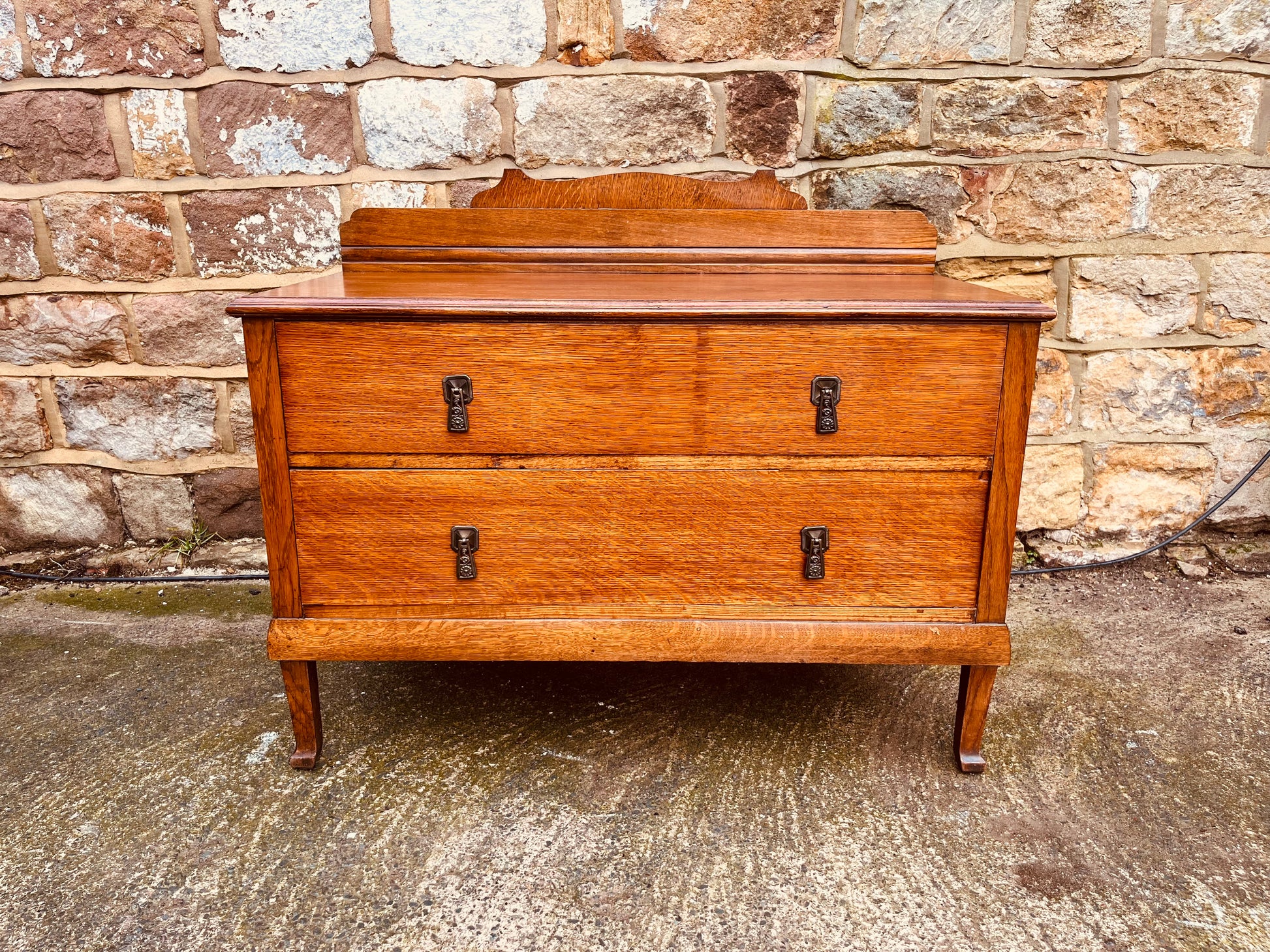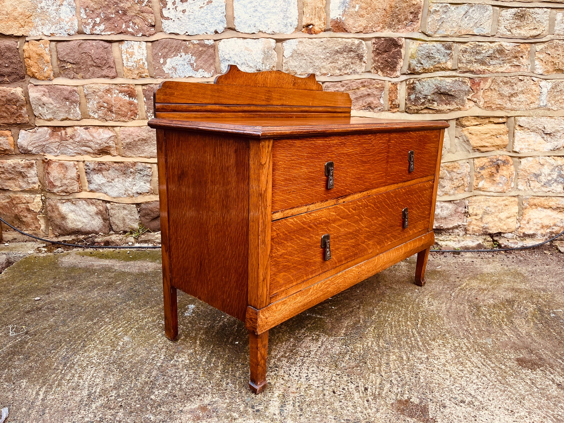 Made from solid oak throughout, this piece features two deep drawers fitted with original-style metal handles, raised on elegant legs and finished with a shaped raised back / splash rail — a distinctive detail that adds both visual interest and architectural presence.