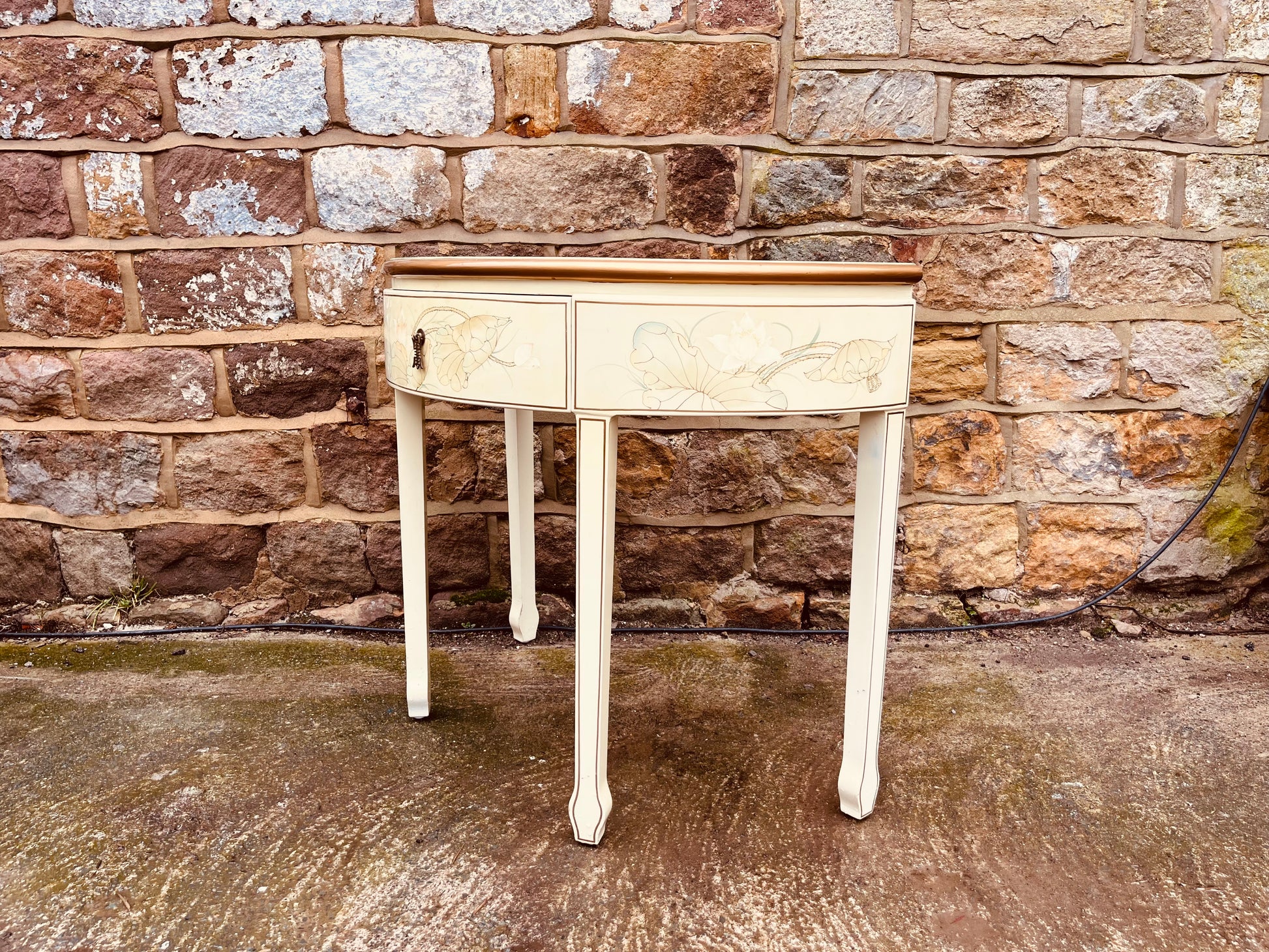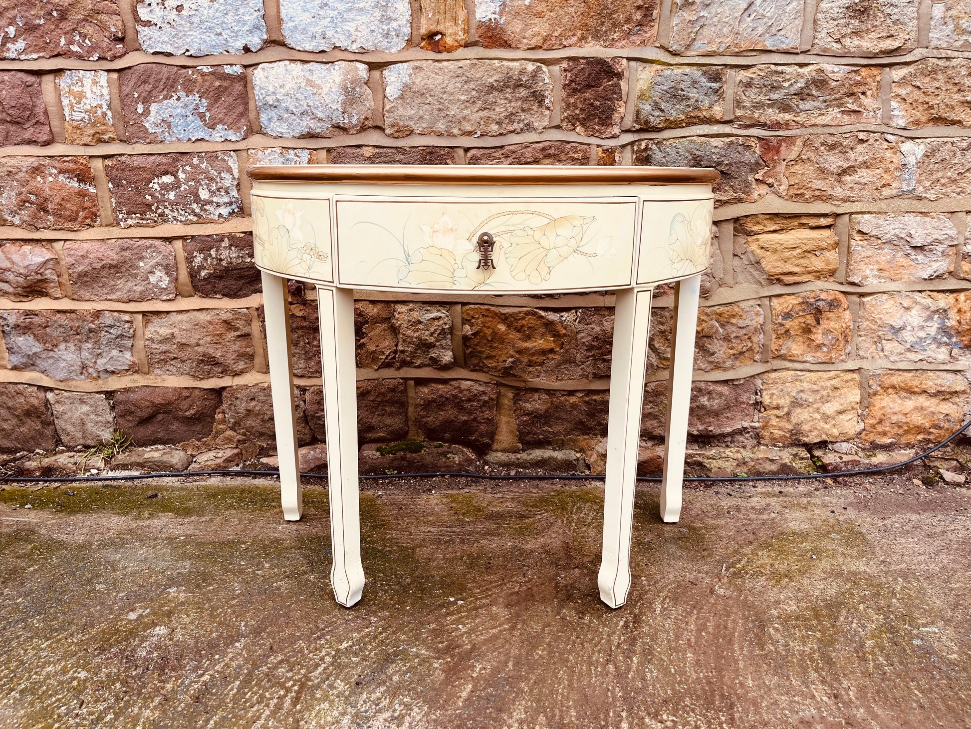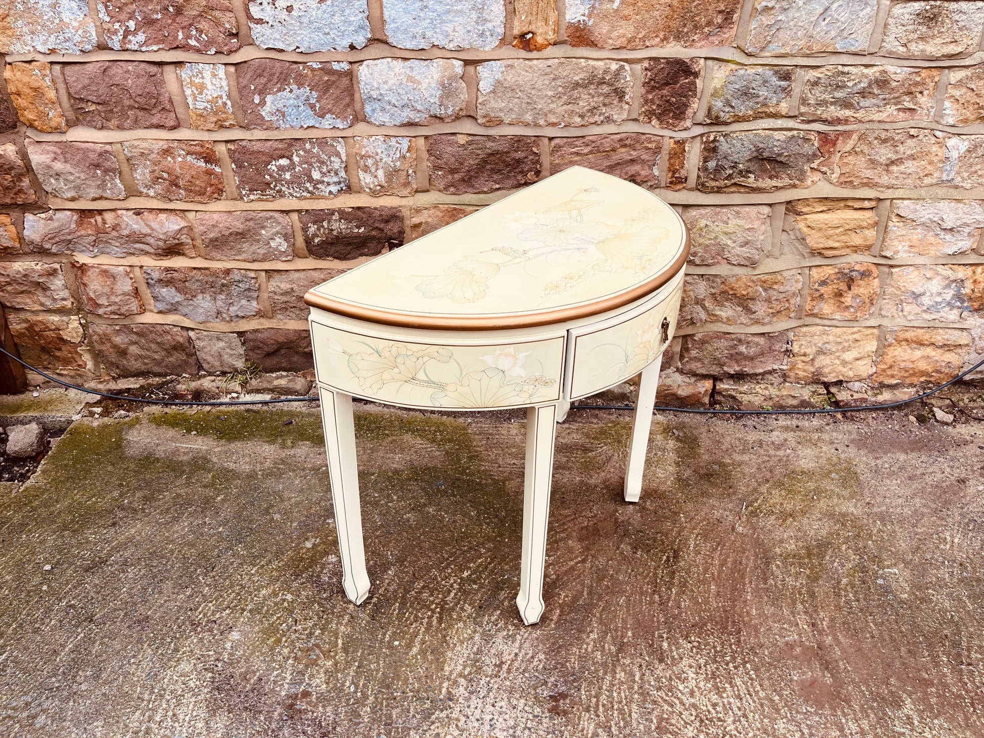 Chinese Lacquer Demi Lune Console Table – Hand Painted Cream Oriental Hall Table