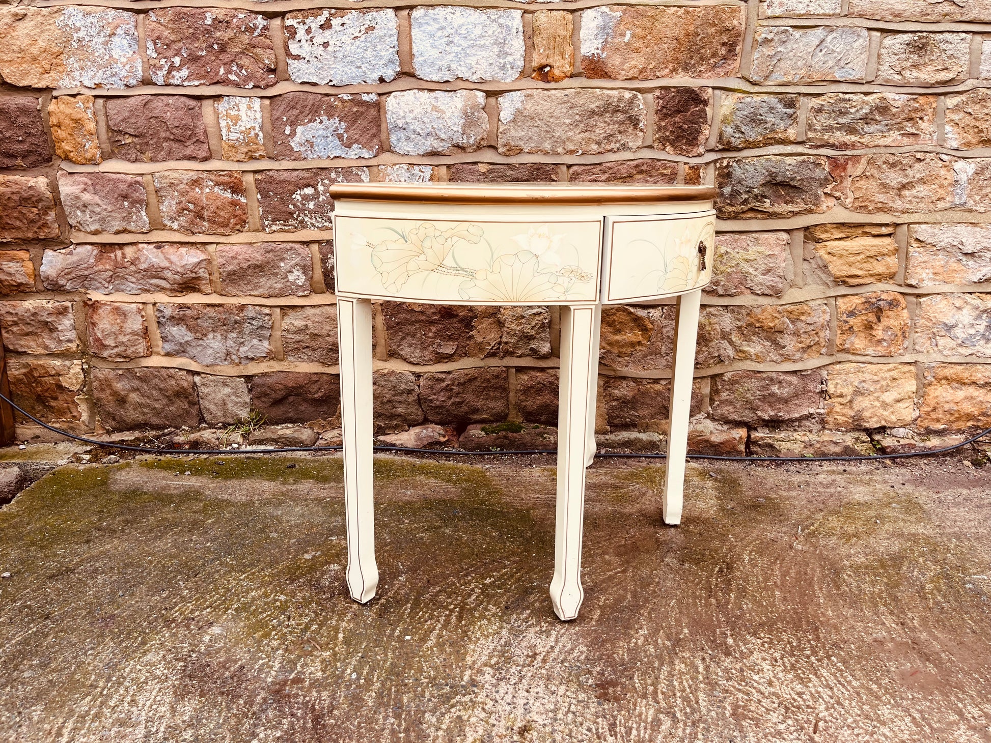 A decorative vintage Chinese lacquer demi-lune console table, finished in a soft cream tone with delicate hand-painted floral detailing. The elegant half-moon silhouette and slender cabriole legs give this piece a refined, timeless presence, making it ideal for hallways, bedrooms or styled beneath a mirror.