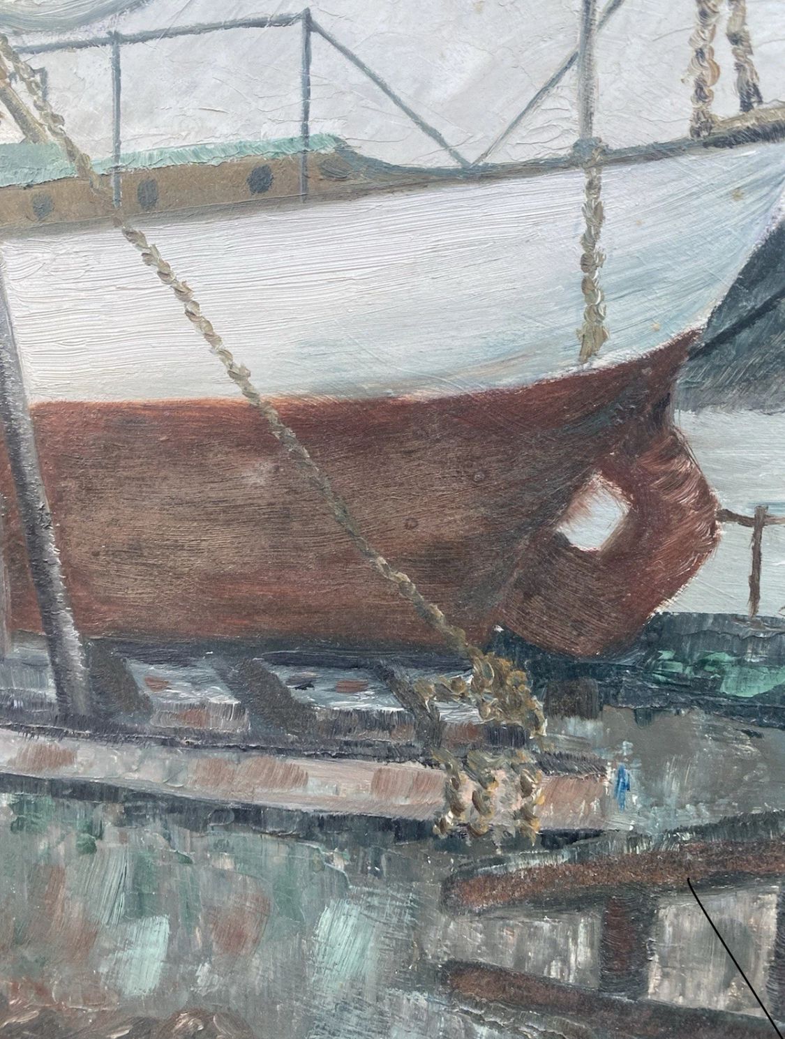 Exhibited 1967 British Maritime Oil Painting by Elsie M. Barrett – Dry Dock / Repairs, Bangor