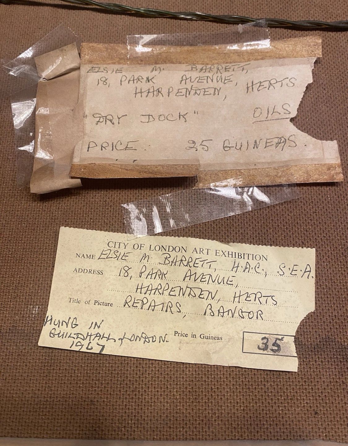 The painting was exhibited at the City of London Art Exhibition at Guildhall in 1967, with original exhibition labels and handwritten artist documentation still intact on the reverse. This level of provenance is increasingly rare and elevates the piece beyond decorative art into genuinely collectable British exhibition work.
