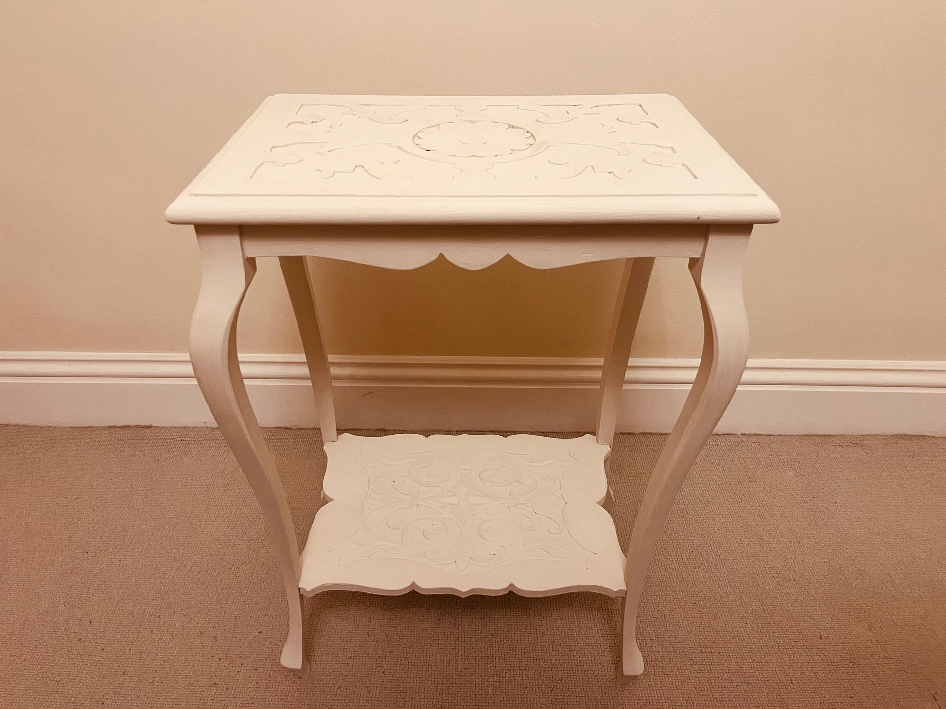 This elegant French-style side table has been beautifully hand-carved and finished in a soft ivory tone, showcasing intricate floral detailing across both tiers. The gently curved cabriole legs and scalloped apron give it a timeless sense of grace and charm, perfect for adding character to a bedroom, hallway, or living space.