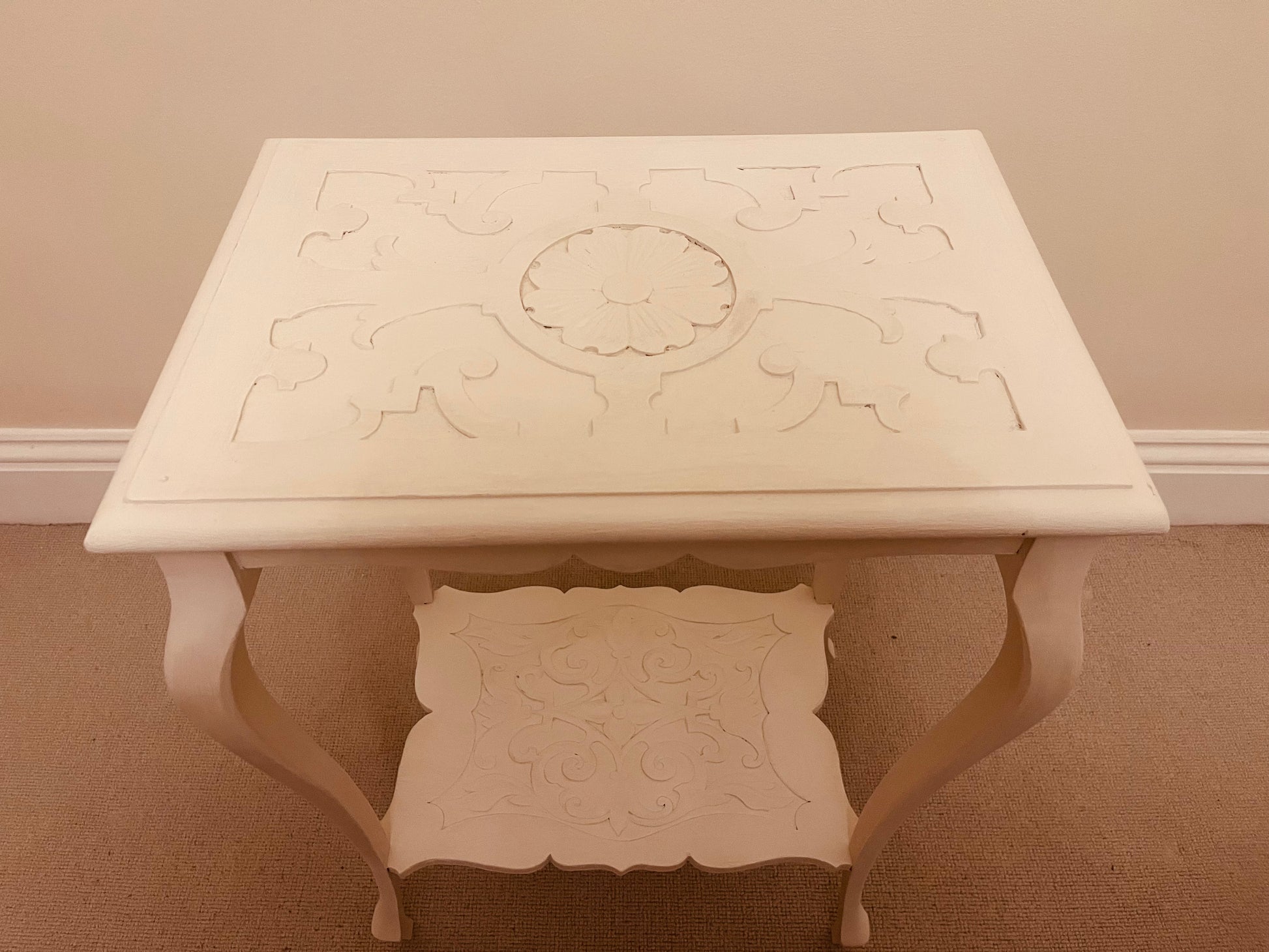 Hand-Carved French Style Side Table – Ivory Painted Wooden Table with Ornate Detailing and Cabriole Legs