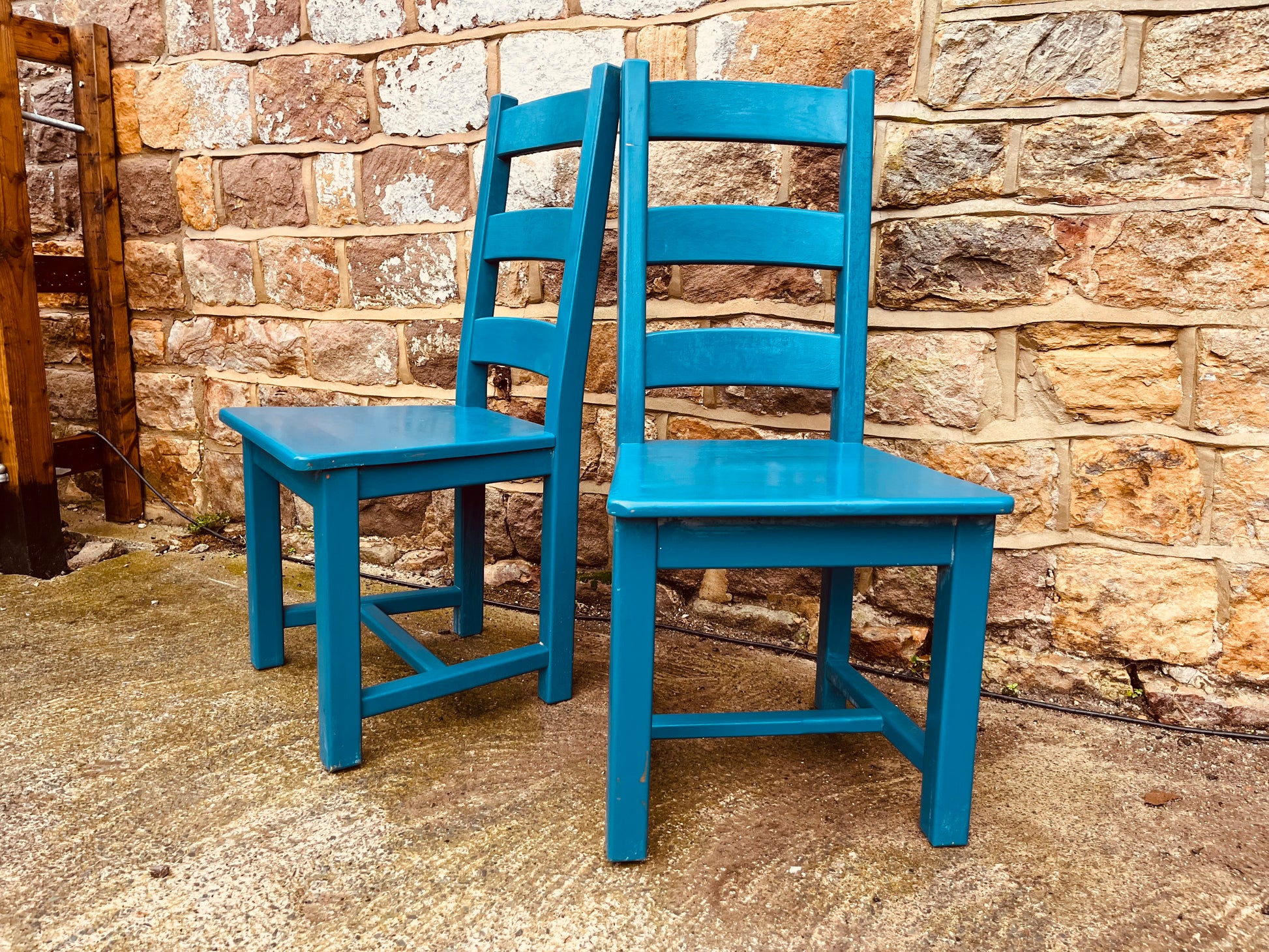 Add a bold splash of colour and rustic charm to your home with this beautiful pair of handmade wooden chairs, freshly upcycled in a striking teal blue. Perfect for farmhouse kitchens, cosy dining spaces, cottage interiors, cafés, or as unique accent chairs in any room.