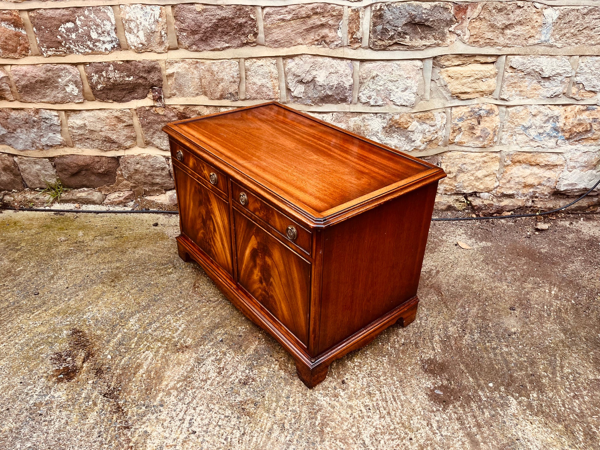 A beautifully crafted vintage mahogany storage cabinet, featuring rich flame-mahogany veneer doors, elegant lines and classic brass knob handles. Compact yet full of character, this piece works perfectly as a small sideboard, record cabinet, hallway cupboard, bedside cabinet, or media unit.
