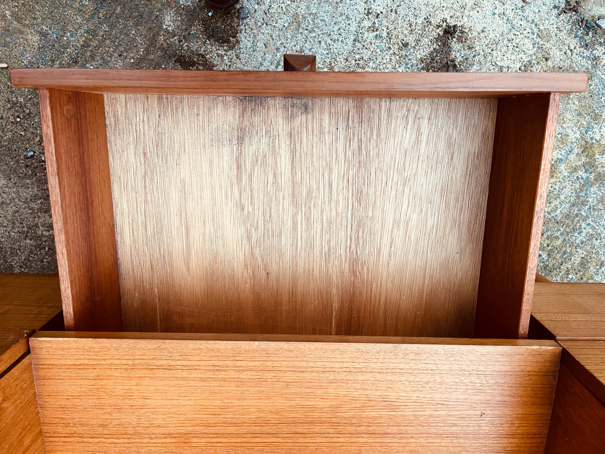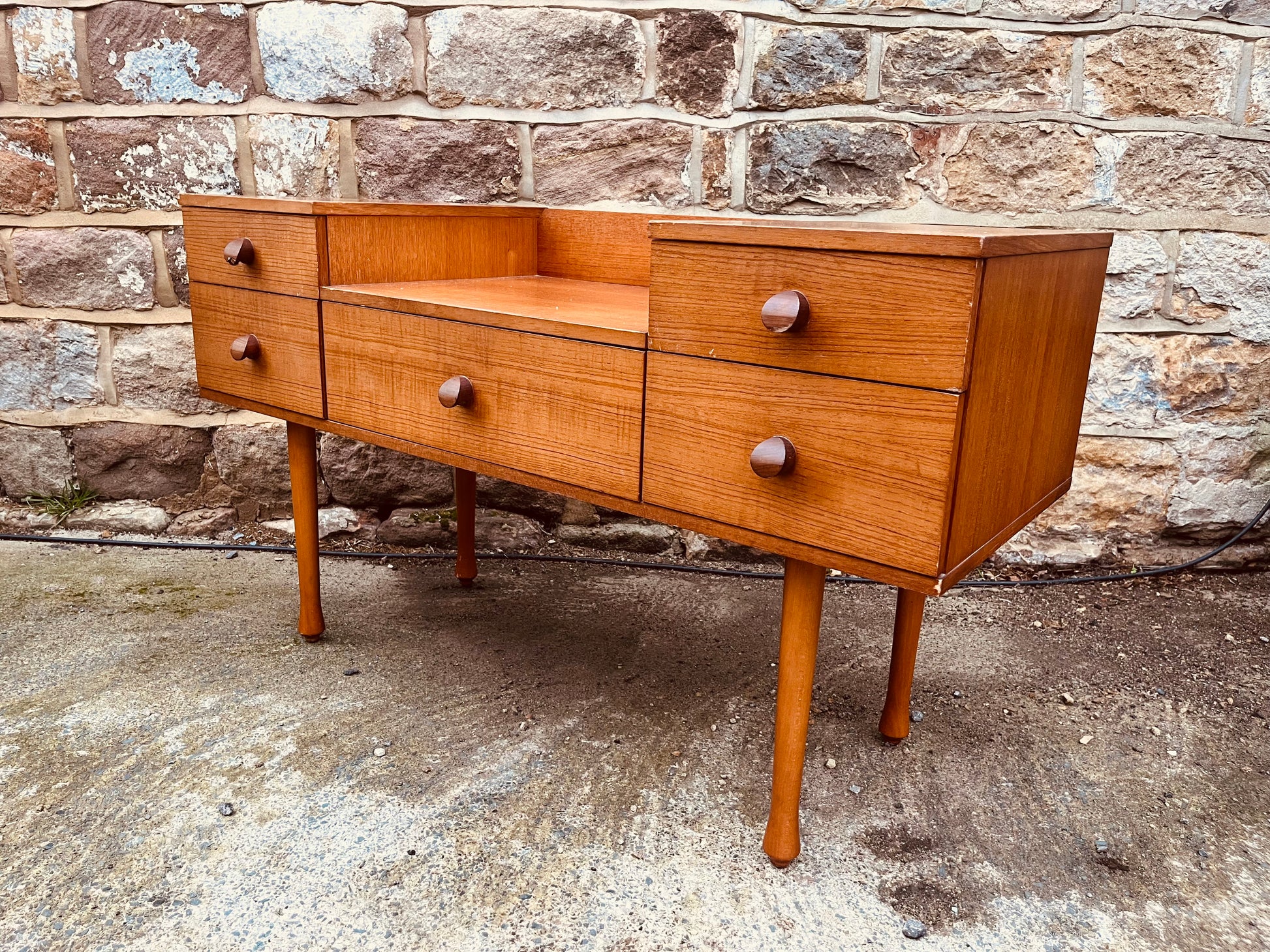 A charming mid-century teak dressing table with six drawers and a raised central section. The warm teak grain, simple round knobs and tapered legs give it that classic 1960s look – minimal, elegant and practical. Compact in size but full of storage, it works beautifully as a dressing table, hallway console, vanity or compact sideboard.
