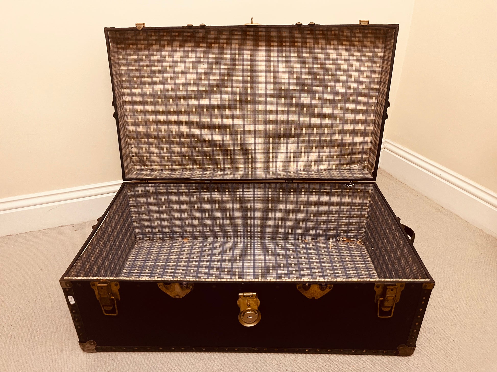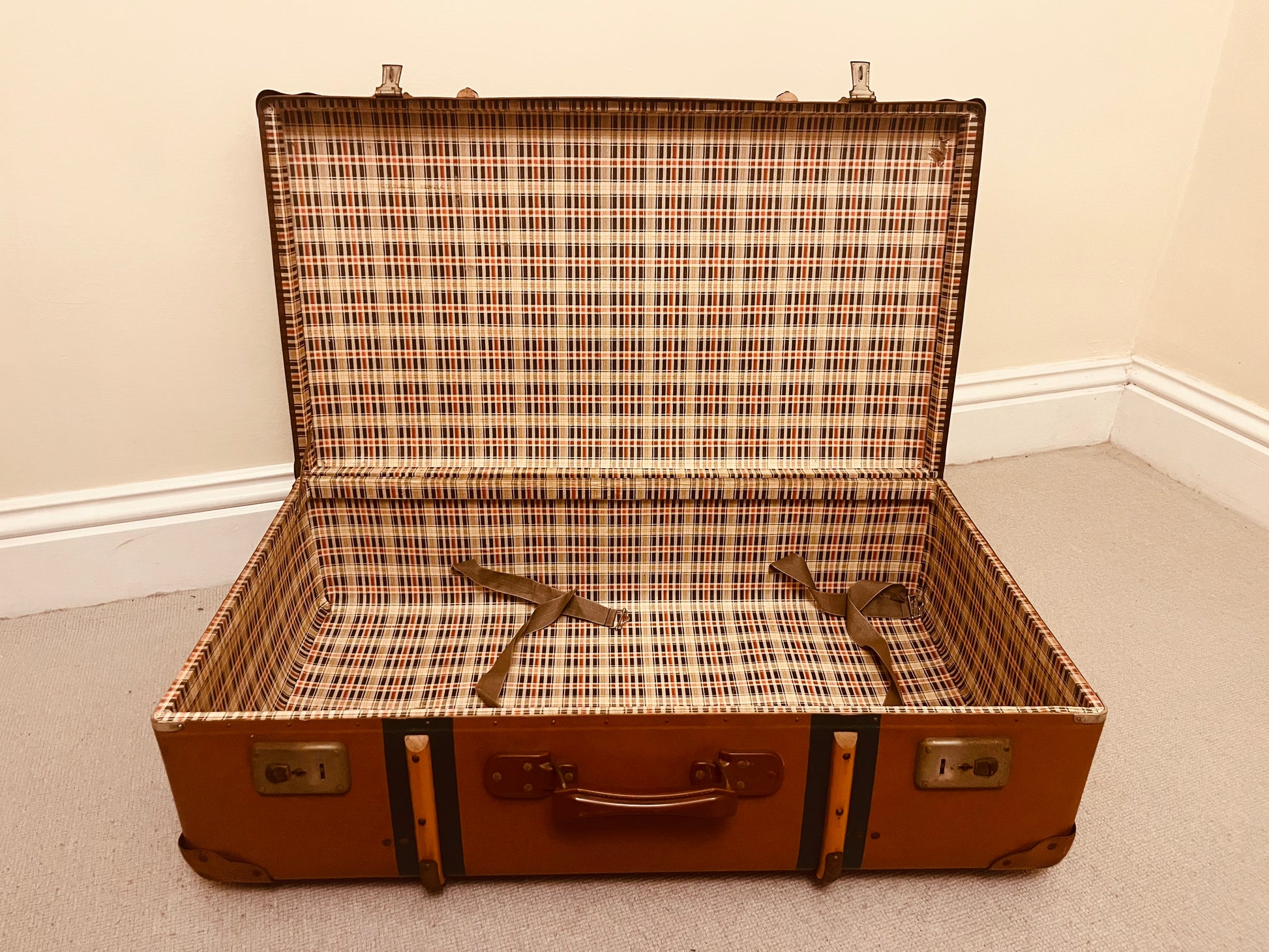 The tan suitcase dates from the 1950s to early 1960s, featuring leather straps, wooden reinforcements and a smart plaid fabric lining. The black metal trunk, likely from the late 1930s to 1950s, showcases brass hardware, riveted construction and industrial elegance — ideal for storage, display or photography props.