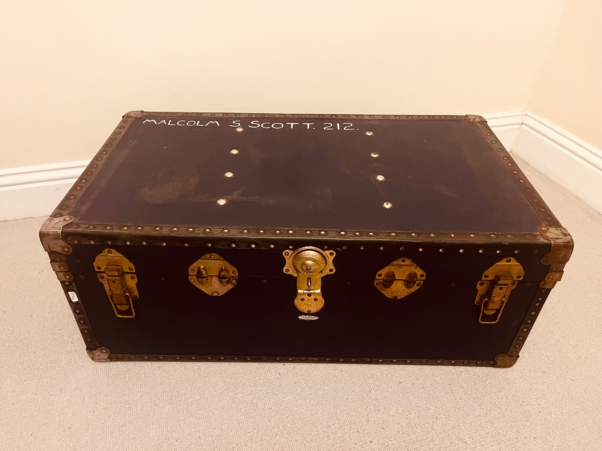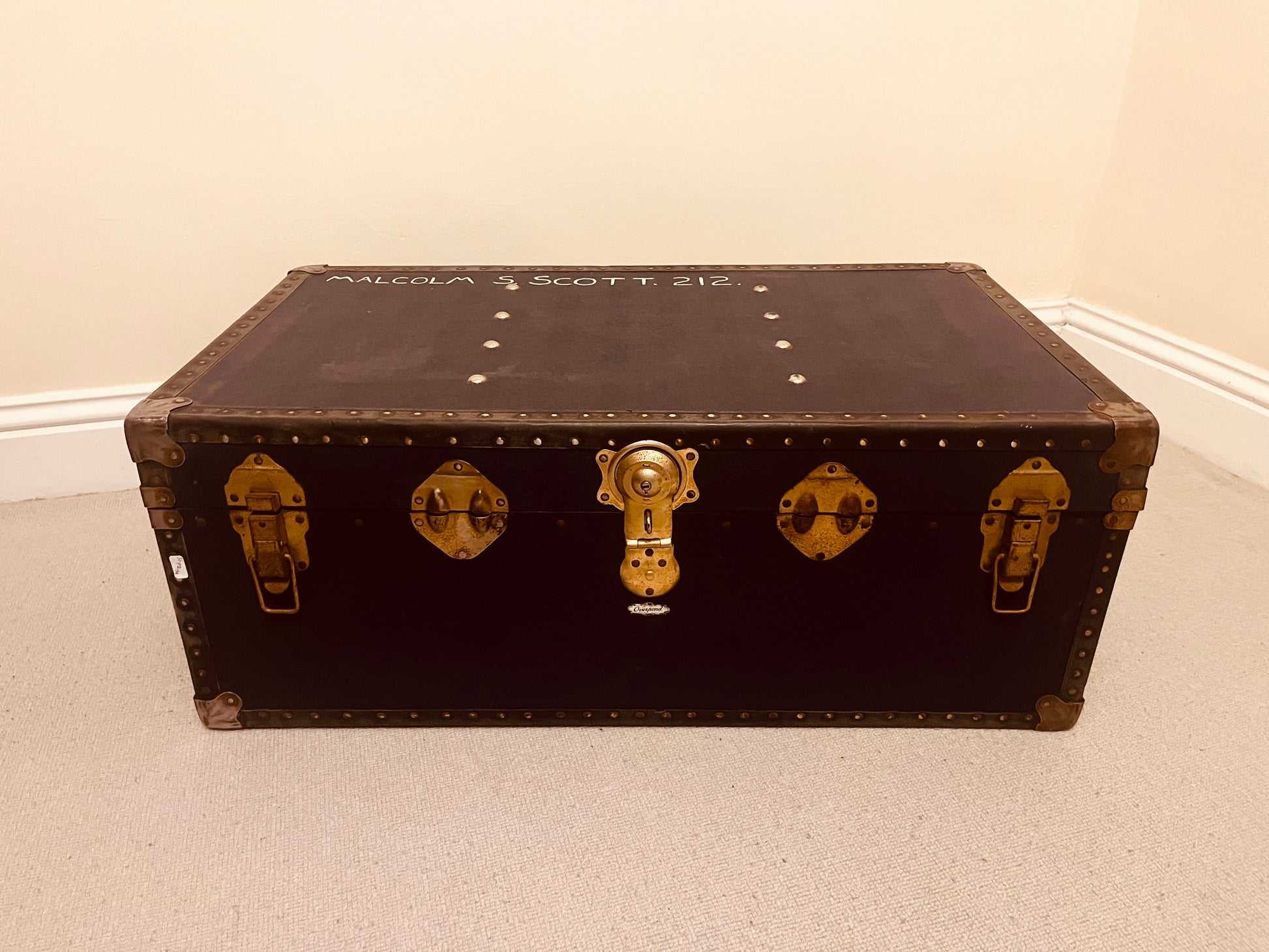 A beautifully matched pair of vintage travel trunks, each full of timeless charm and character. This duo includes a tan leather-strapped suitcase, monogrammed “D.J.”, alongside a black metal steamer trunk hand-painted “Malcolm S. Scott T.212.” Together, they capture the golden age of travel and lend a rich sense of history to any interior.