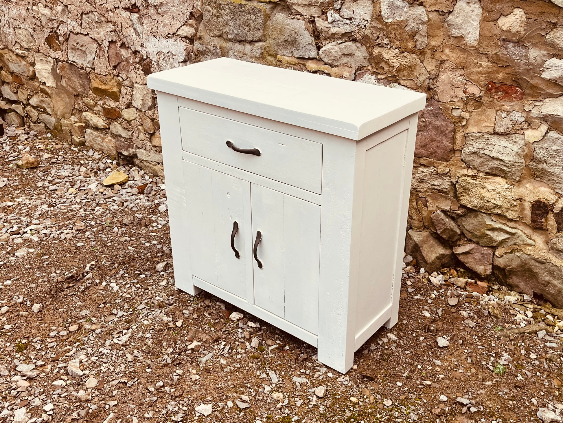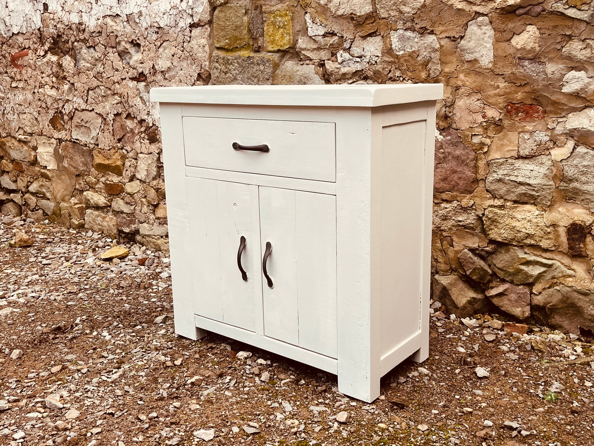 The piece features a spacious top drawer and a double-door cupboard below, providing generous storage while keeping a compact footprint. Its chunky frame, natural wood grain and characterful finish make it the perfect addition to homes looking for both style and substance.