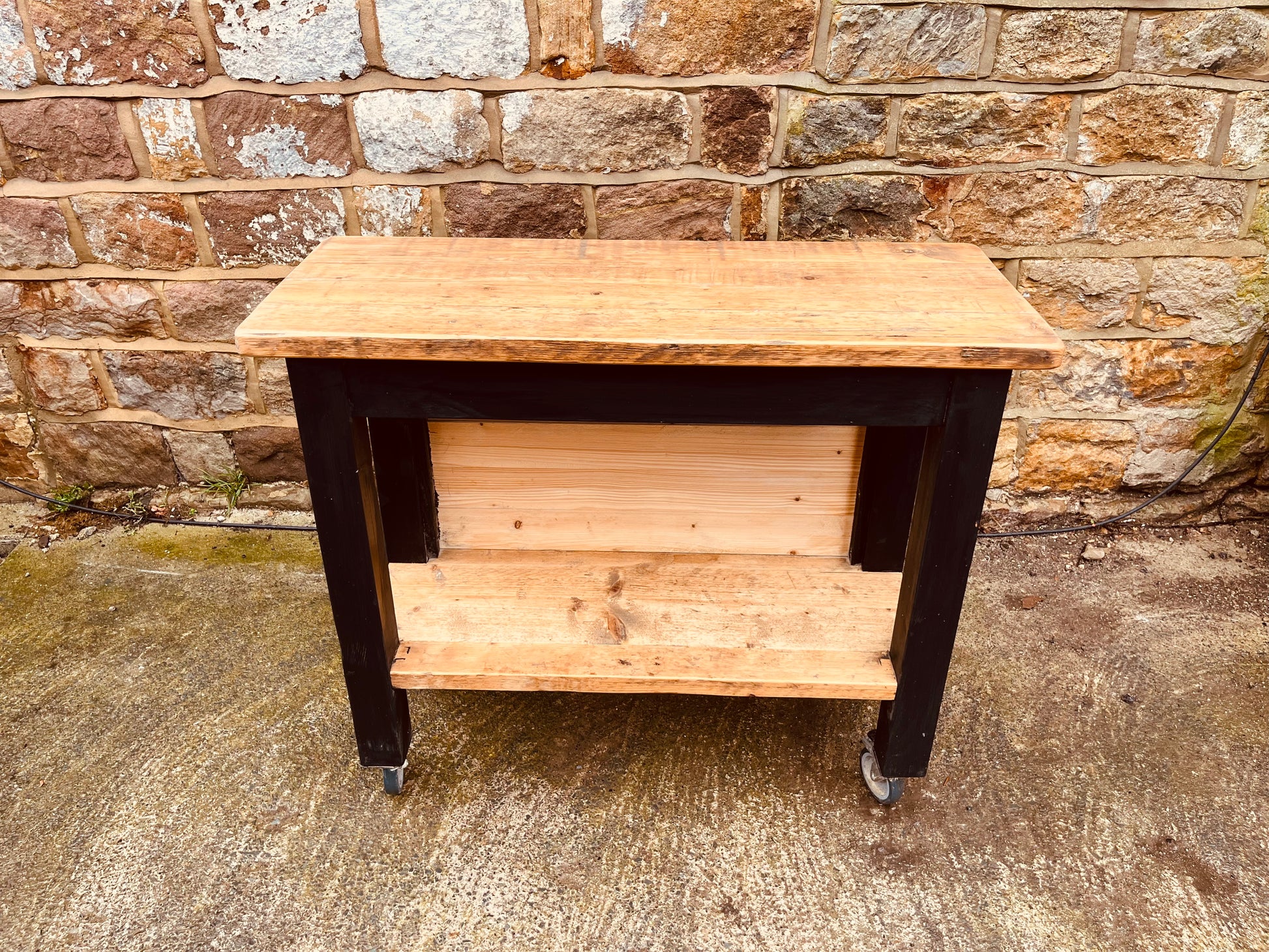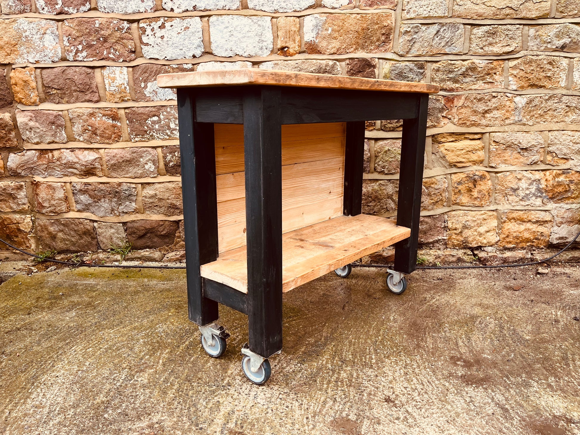 Bring functional charm and rustic industrial style into your home with this handmade wooden trolley, crafted with a solid natural wood top, lower storage shelf and a sleek black frame. Set on smooth castor wheels, it’s a versatile piece that works beautifully as a kitchen island, console table, bar cart, plant stand, or utility/storage station.