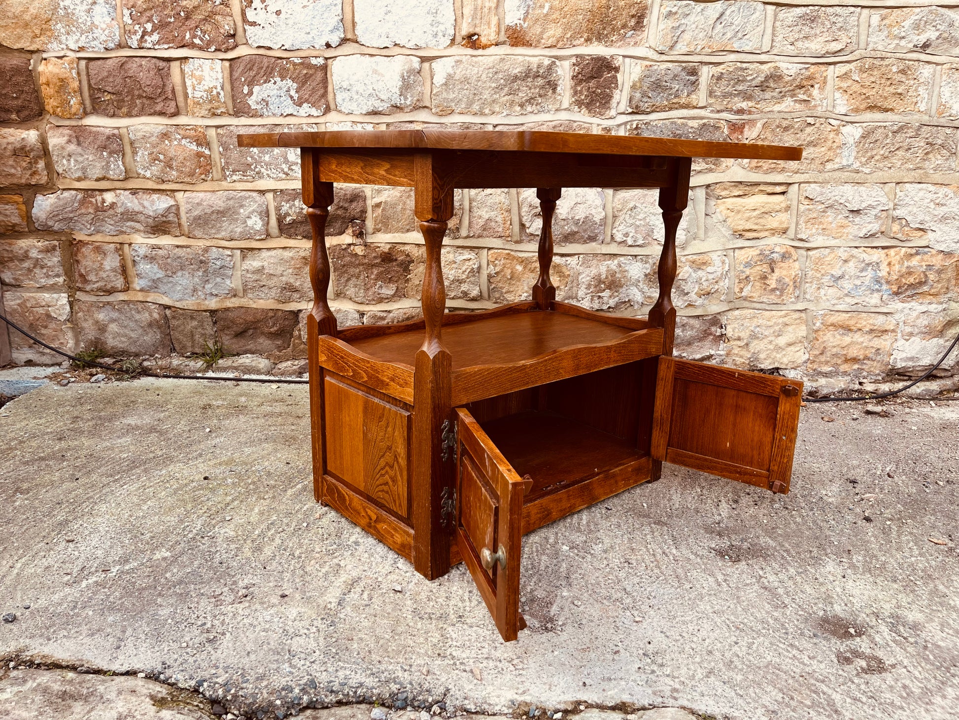 A beautifully crafted rustic solid oak side table featuring turned spindle supports, a shaped lower shelf and a charming double-door storage cupboard. With its warm tone, natural grain and cottage-style character, this piece works perfectly as a lamp table, hallway table, bedside table or compact living-room storage solution.