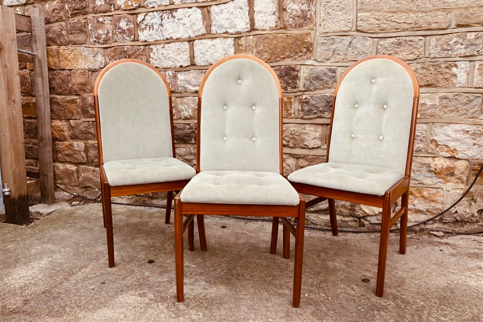 A timeless set of three vintage mid-century dining chairs, dating from the 1960s and influenced by classic Scandinavian design. Featuring warm solid wood frames and softly upholstered seats and backs, these chairs combine elegance, comfort and understated period charm.