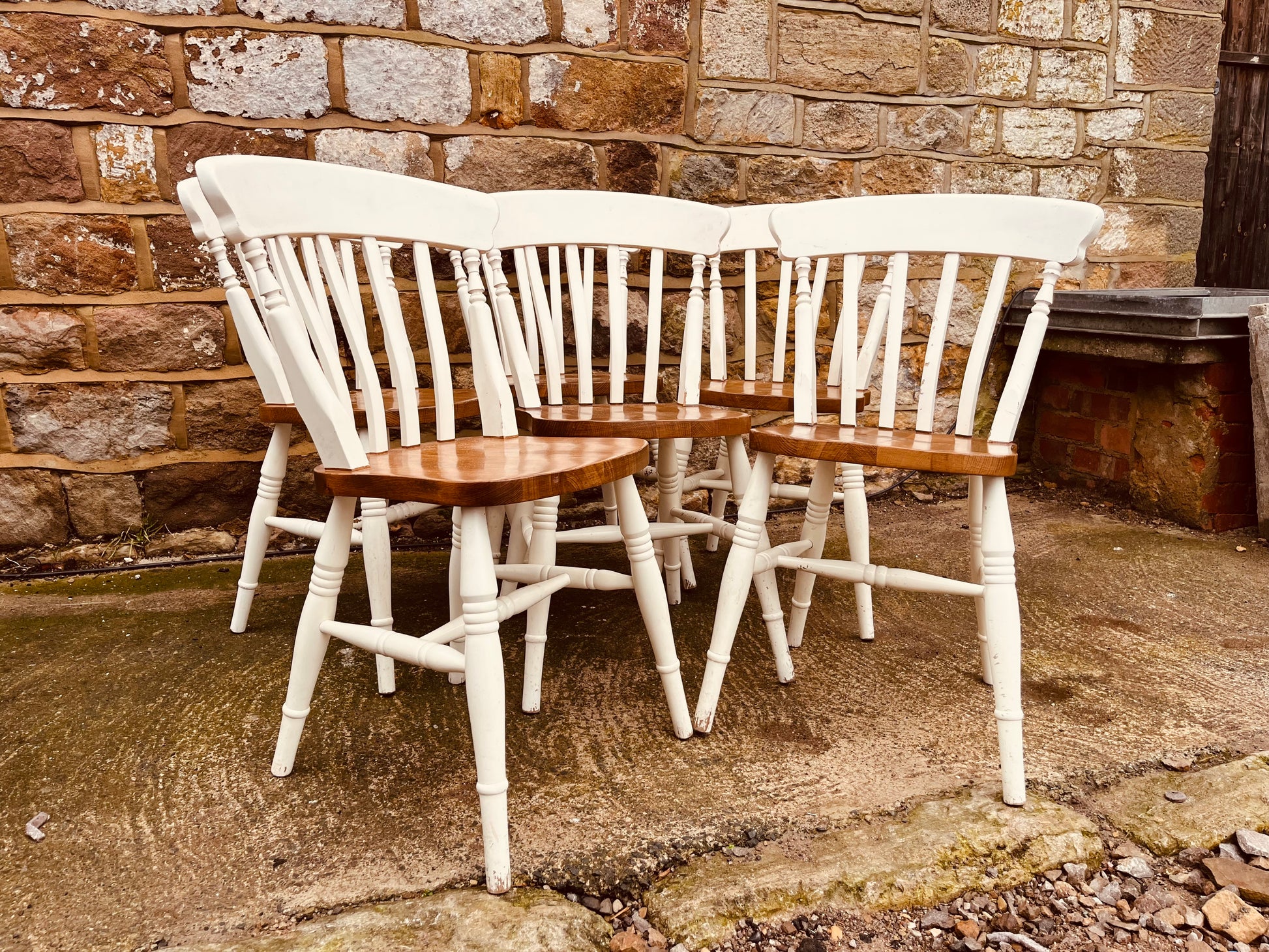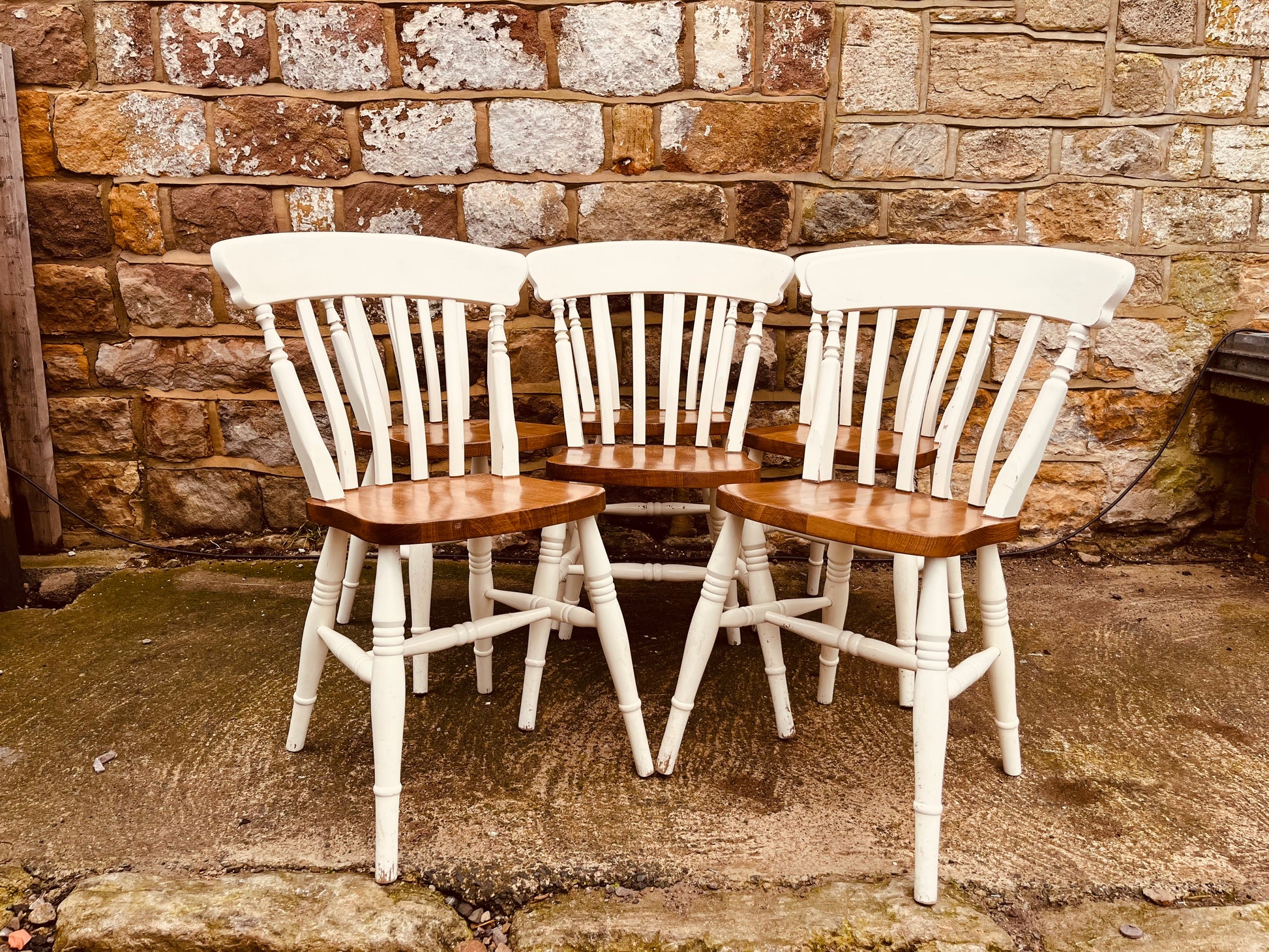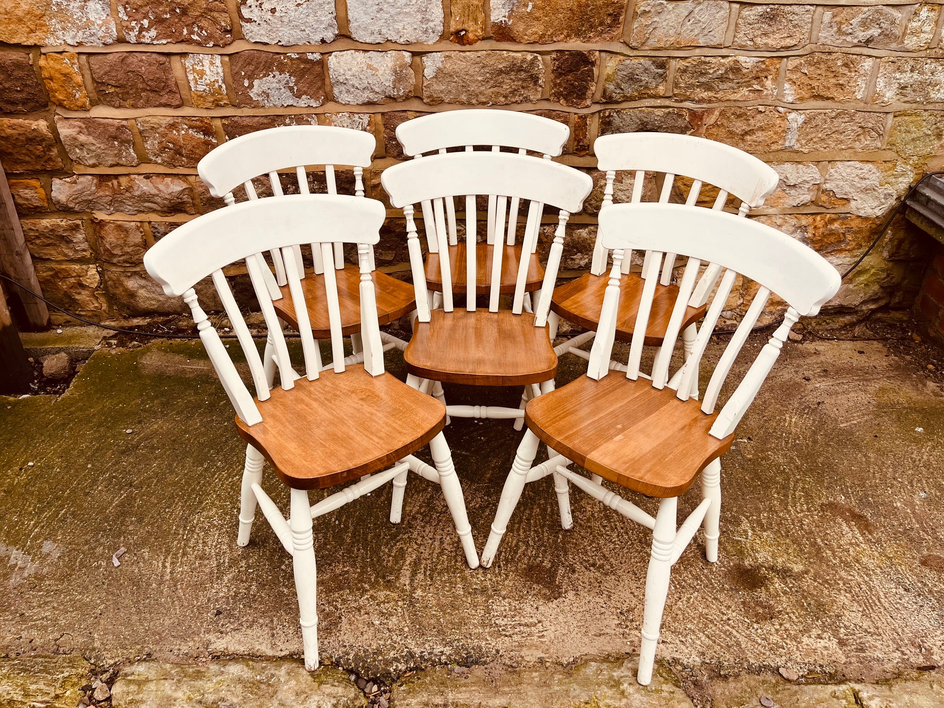 A beautifully matched set of six Windsor-style dining chairs, finished in soft white with contrasting solid wood seats, ideal for farmhouse kitchens and modern country dining spaces.