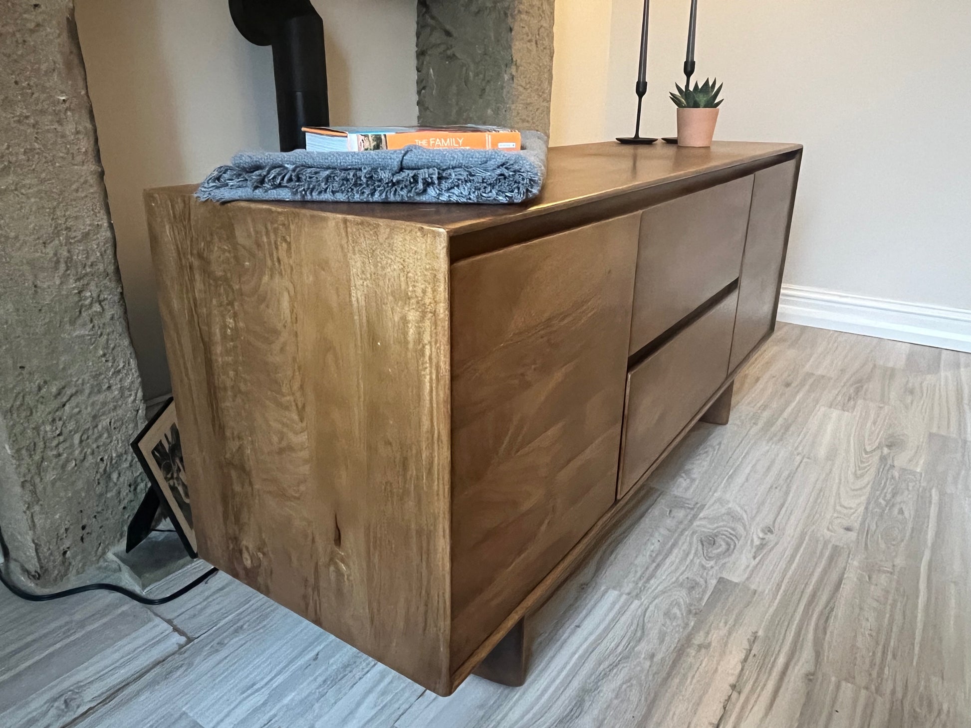 This beautifully crafted solid wood sideboard brings timeless mid-century character to any interior. Its clean lines, minimalist design, and rich natural grain make it a standout statement piece — effortlessly blending warmth and sophistication.