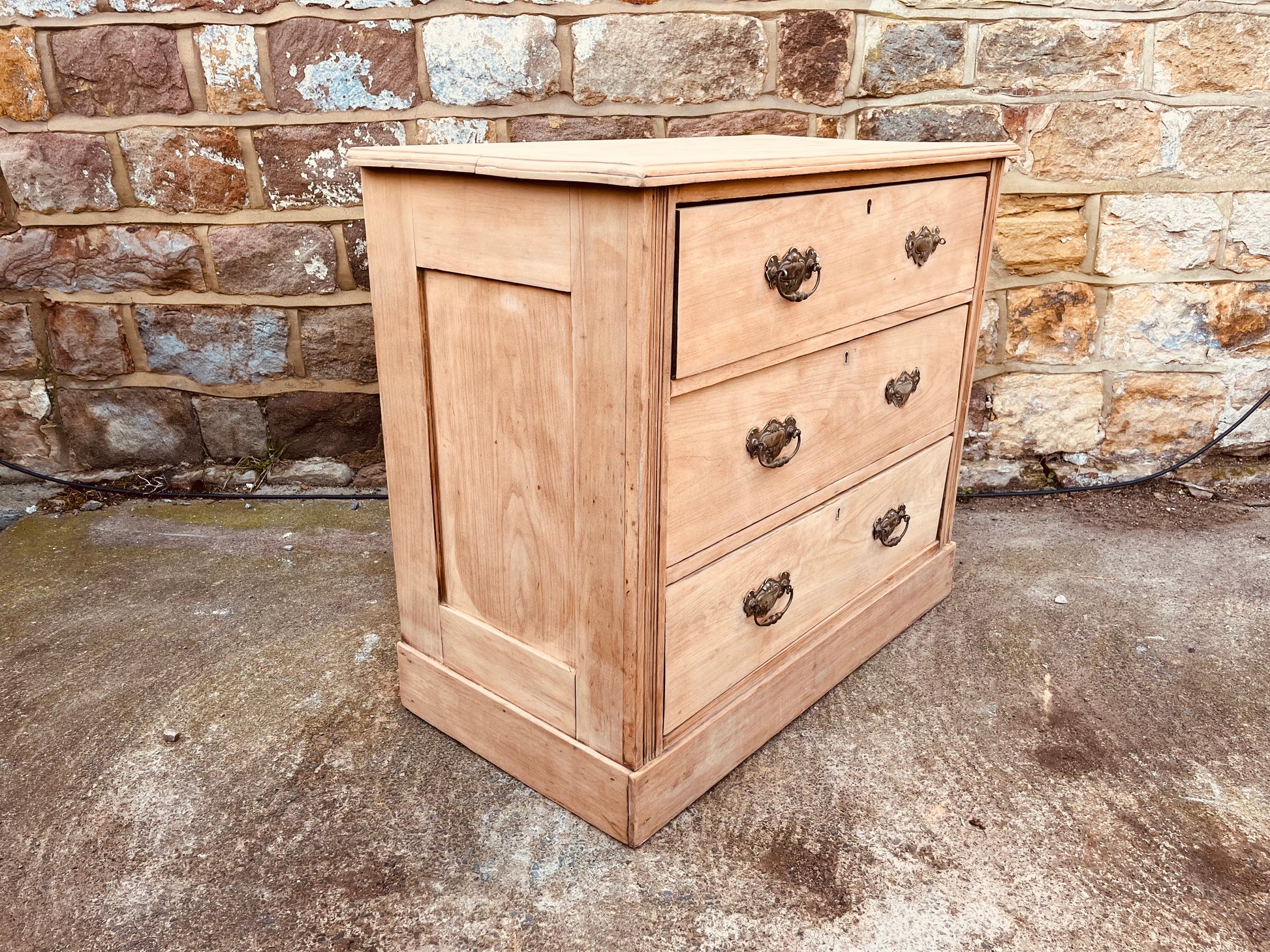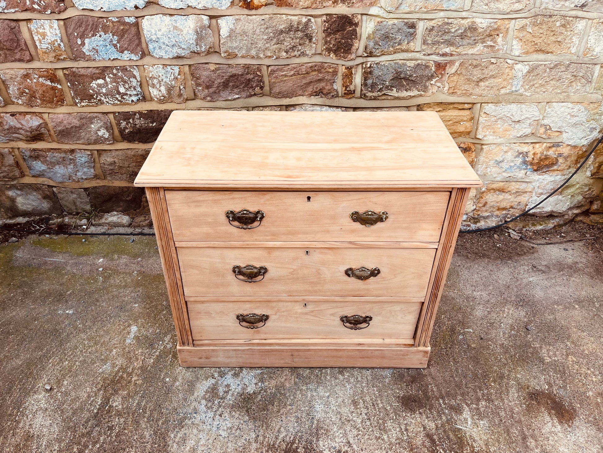 Carefully stripped back to bare wood, the natural grain and subtle variations of the pine are now on full display, giving the piece a soft, neutral finish that works effortlessly in both classic and contemporary interiors. Original brass handles and traditional keyholes have been retained, adding to its authentic vintage appeal.