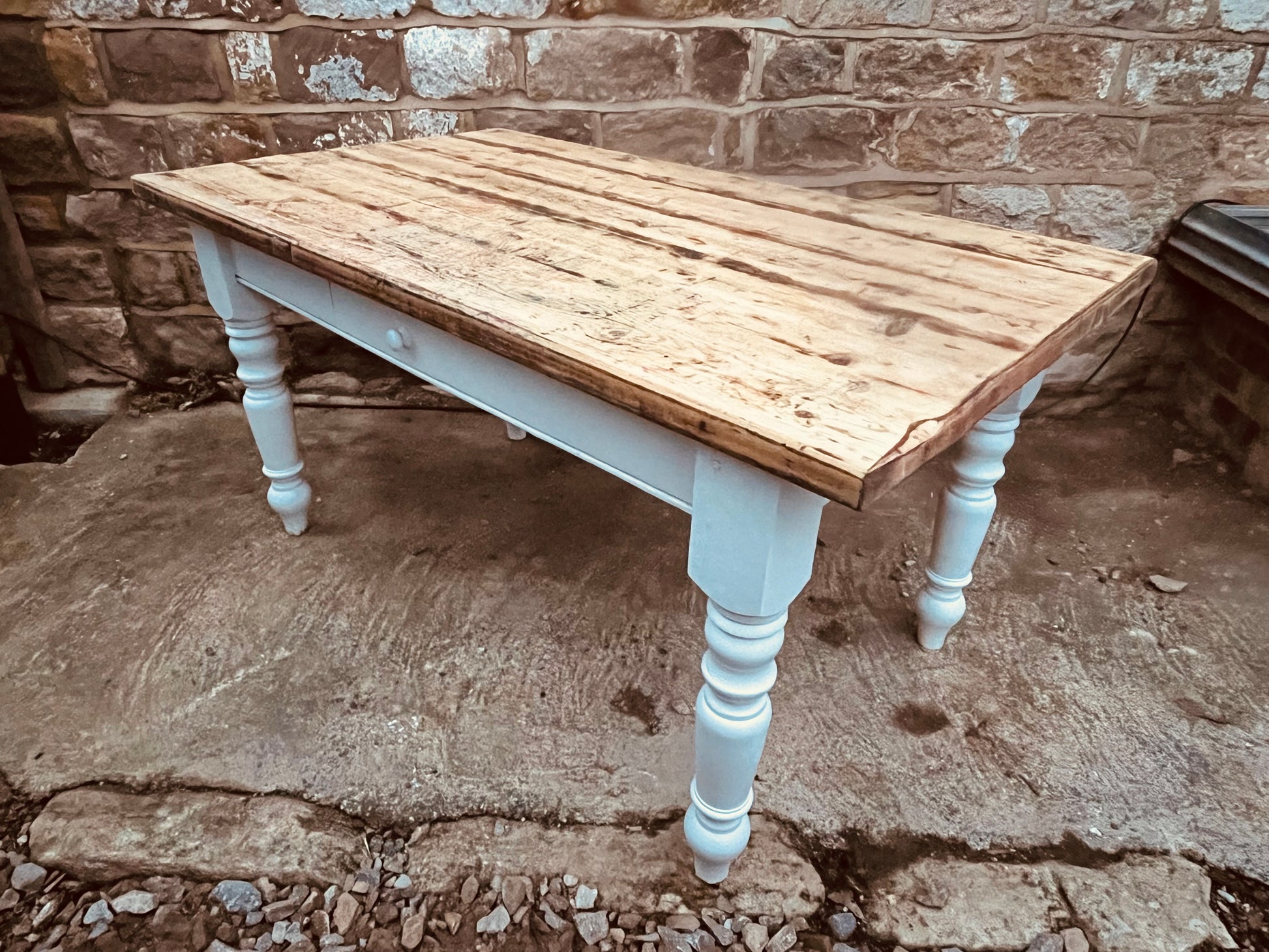A beautifully rustic farmhouse dining table featuring a reclaimed solid wood plank top and painted turned legs. This piece adds warmth, texture and timeless character to any kitchen or dining space, whether modern, cottage or traditional farmhouse style.