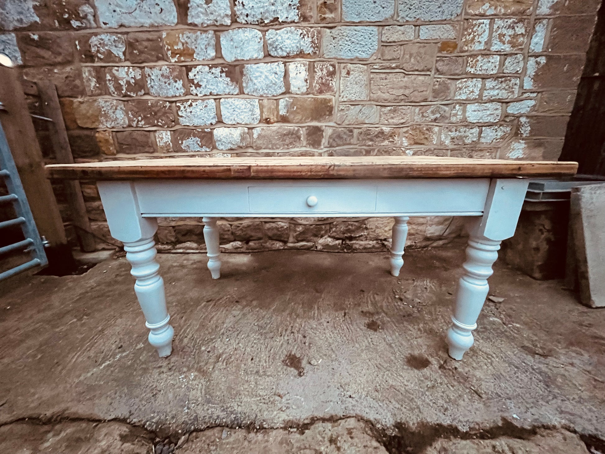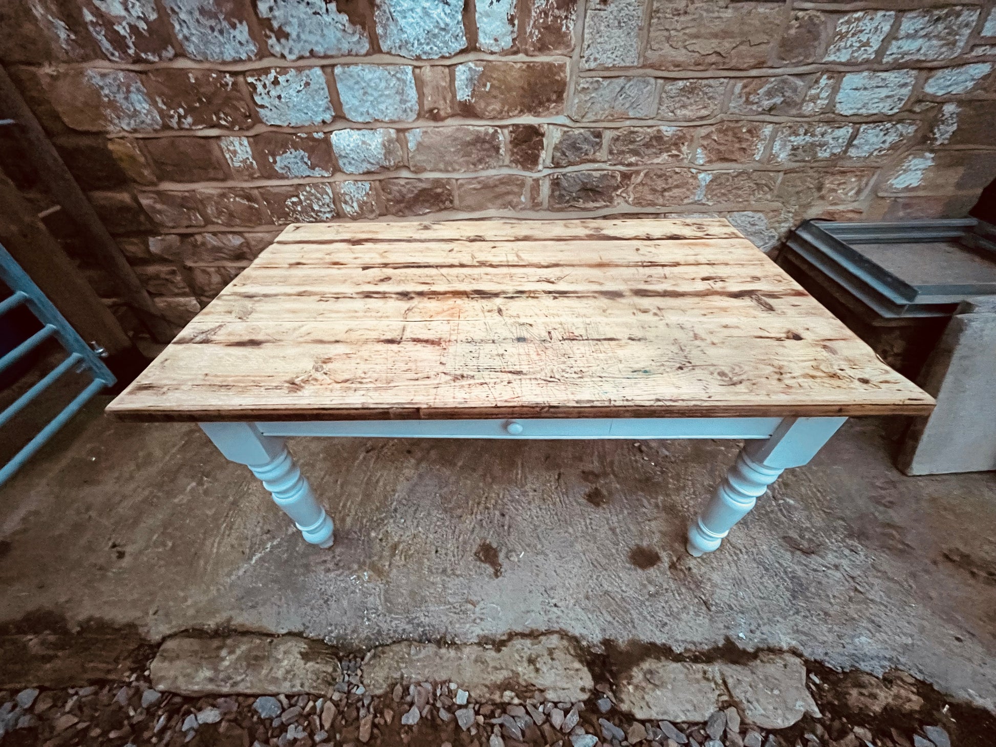 The reclaimed top has been lightly restored to preserve its natural aged charm, showing grain, knots and the marks of time that make every table unique. The painted base gives a clean contrast and classic country look. Solid, sturdy and full of personality — made to last and made to be used.