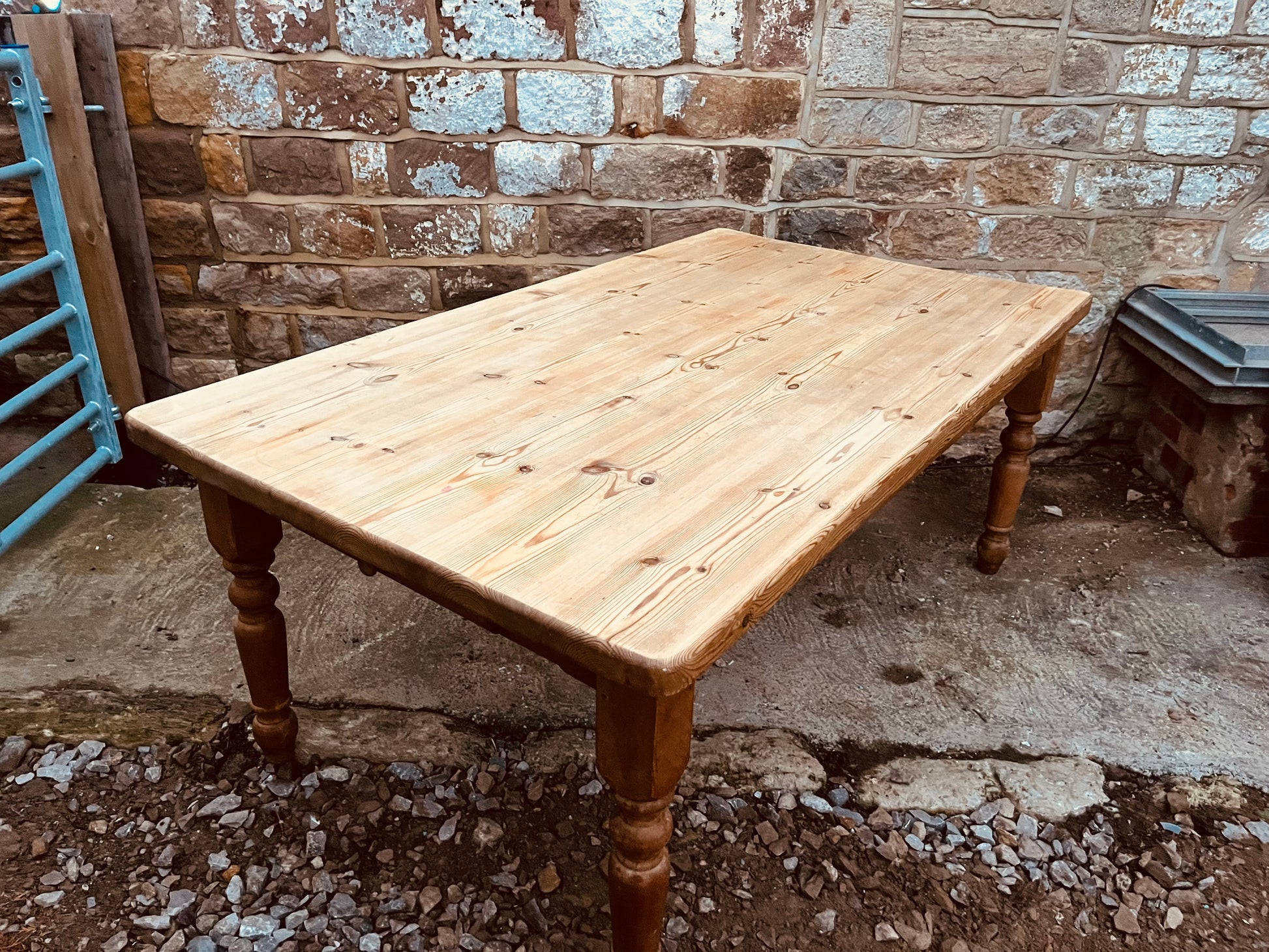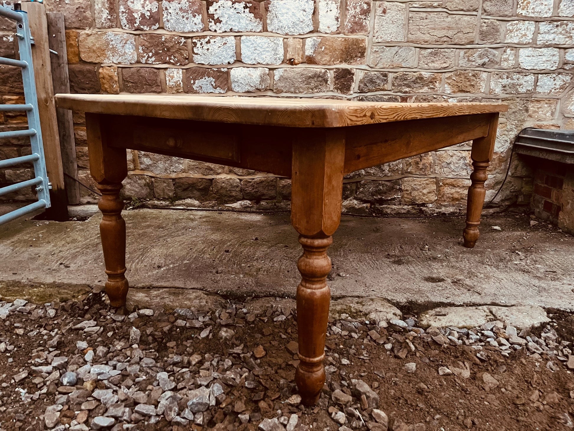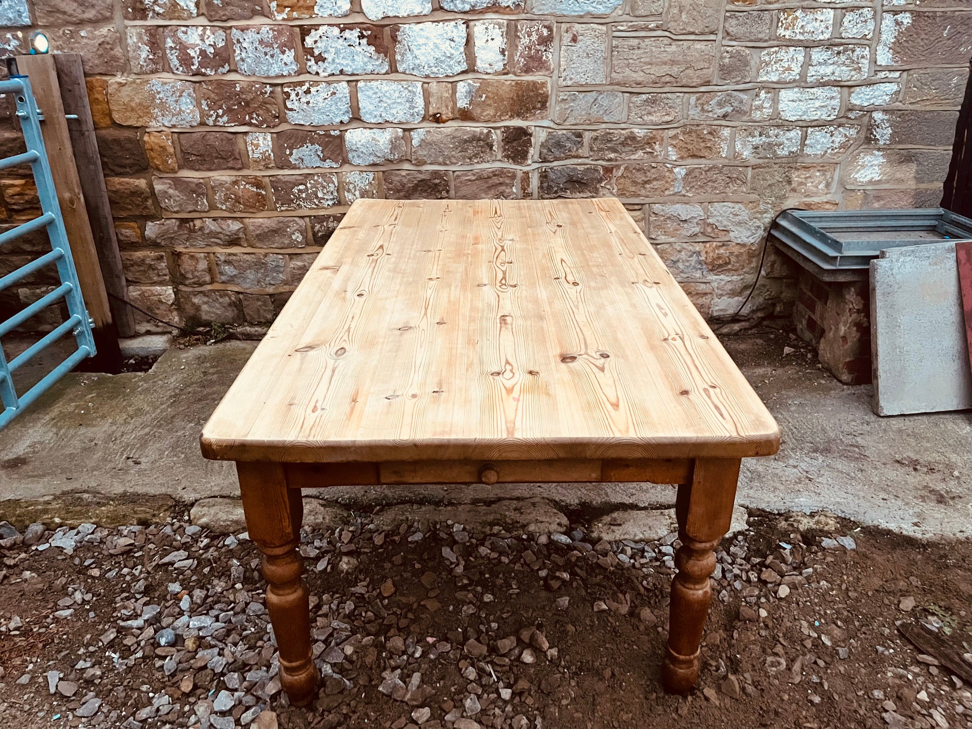 A rustic solid pine farmhouse dining table with a beautifully scrubbed plank top, turned legs and a central drawer for storage. Full of charm and character, this piece suits cosy cottages, farmhouse kitchens and rustic country homes. The scrubbed top shows natural grain and knots, giving it a warm, lived-in feel that only real wood can offer.