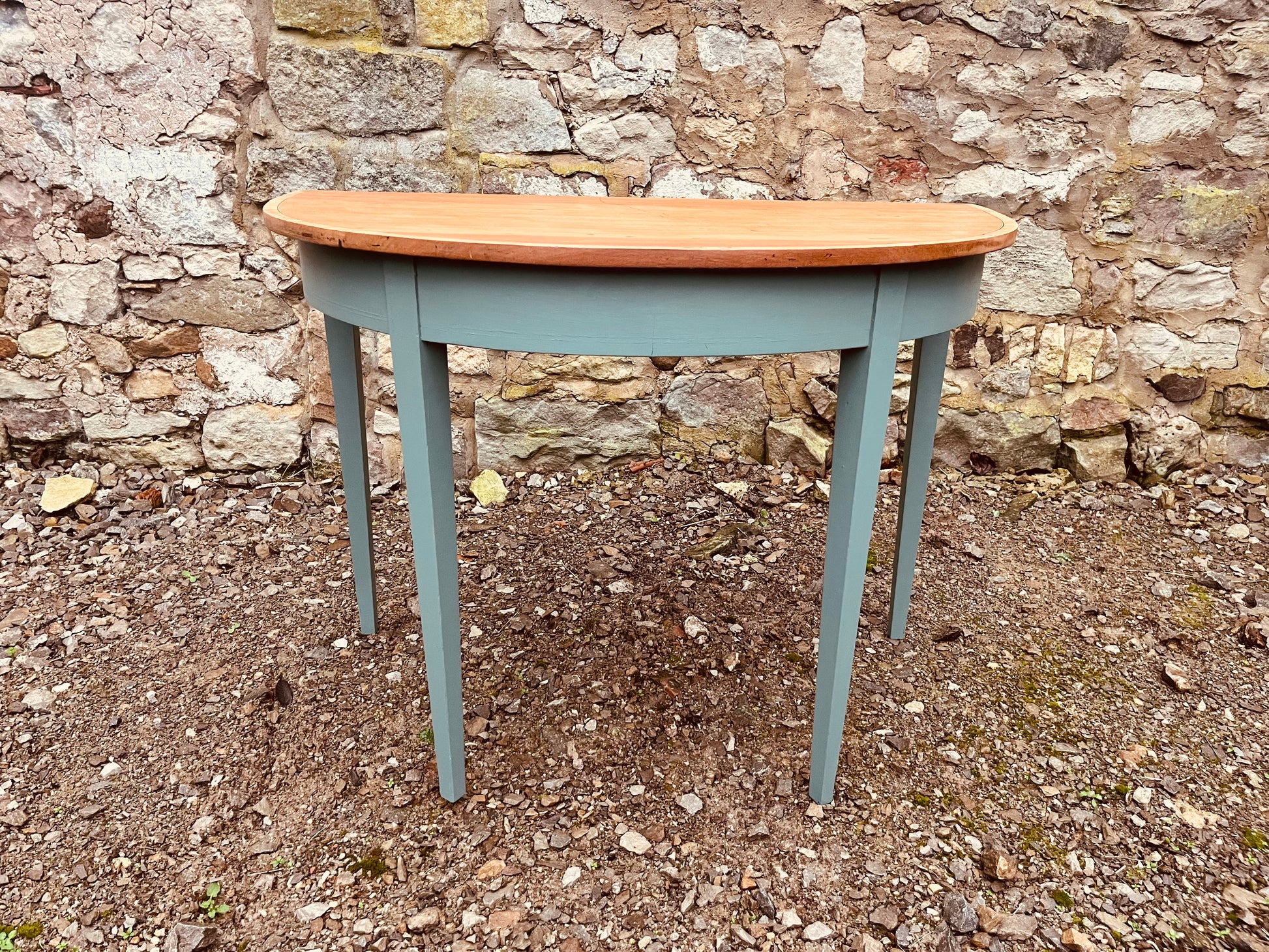 A charming vintage demi-lune console table, hand-painted in a soft, timeless shade that complements both modern and rustic interiors. The classic half-moon shape makes it perfect for hallways, living rooms, entryways or any space that needs a subtle, stylish accent.