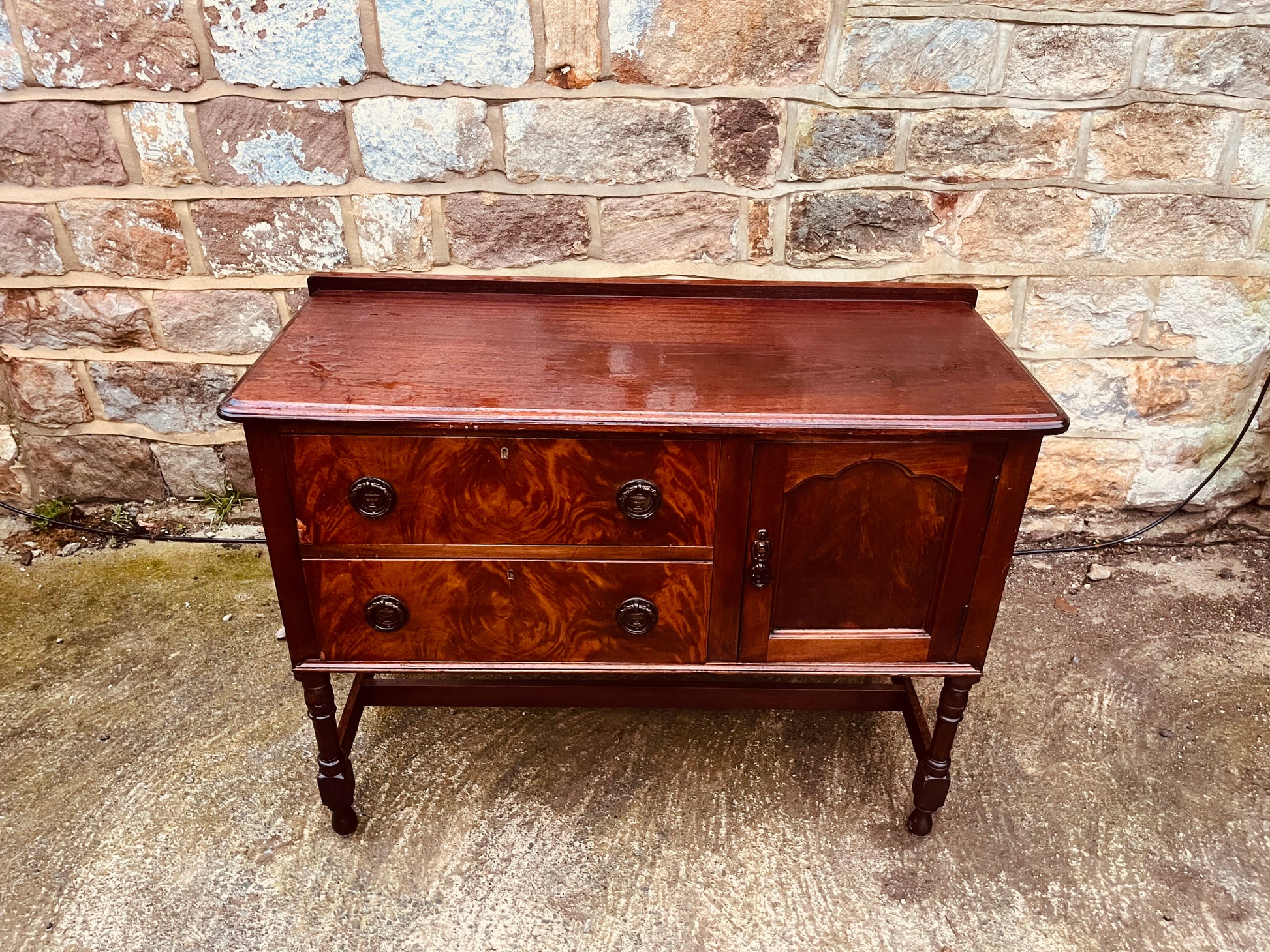 Add timeless character to your home with this vintage mahogany sideboard, complete with two burr veneer drawers, a single cupboard door and elegant turned legs with stretcher base. A beautifully crafted piece offering both style and storage — perfect for a hallway, dining room, living room, bedroom or cottage interior.