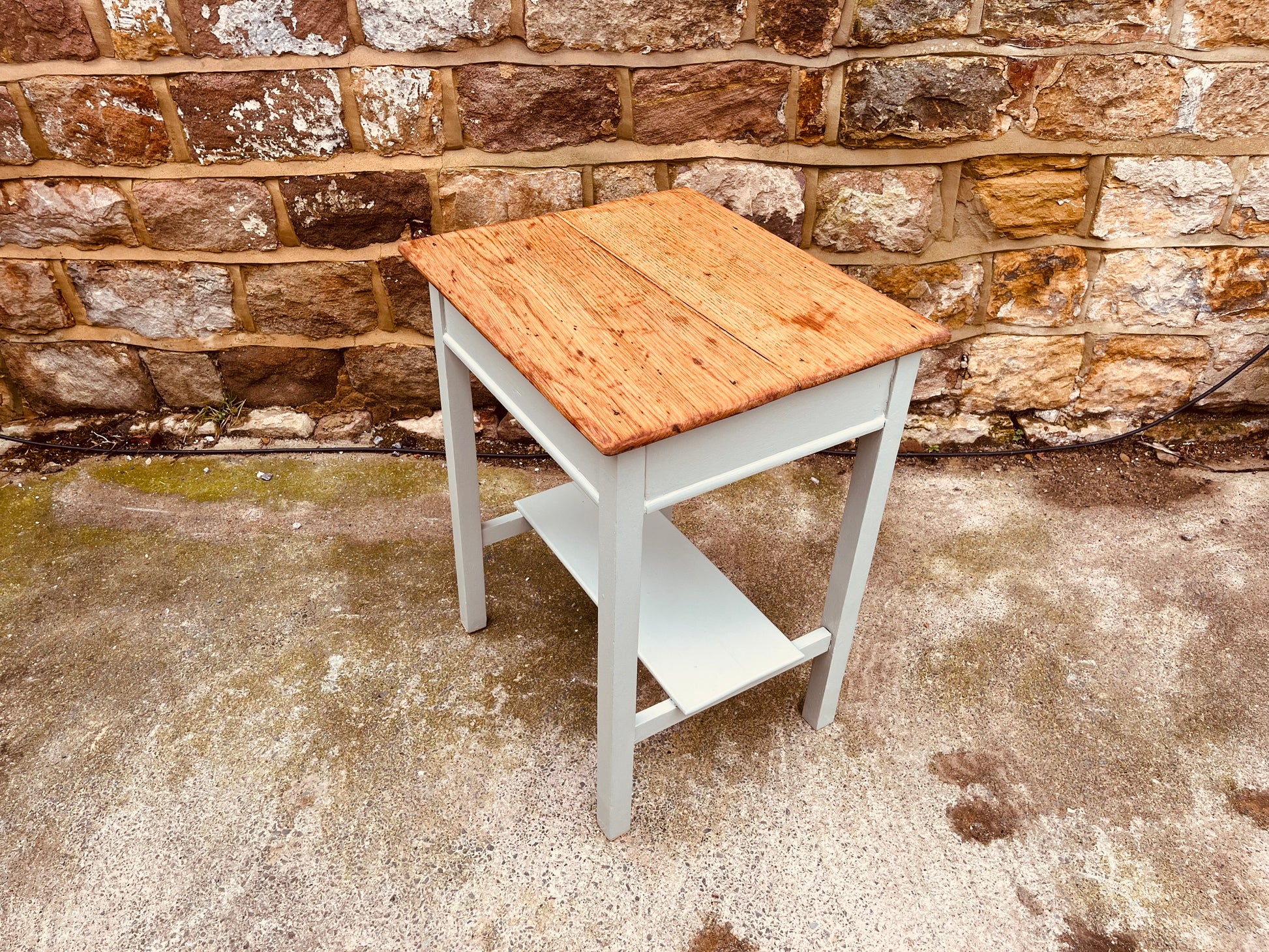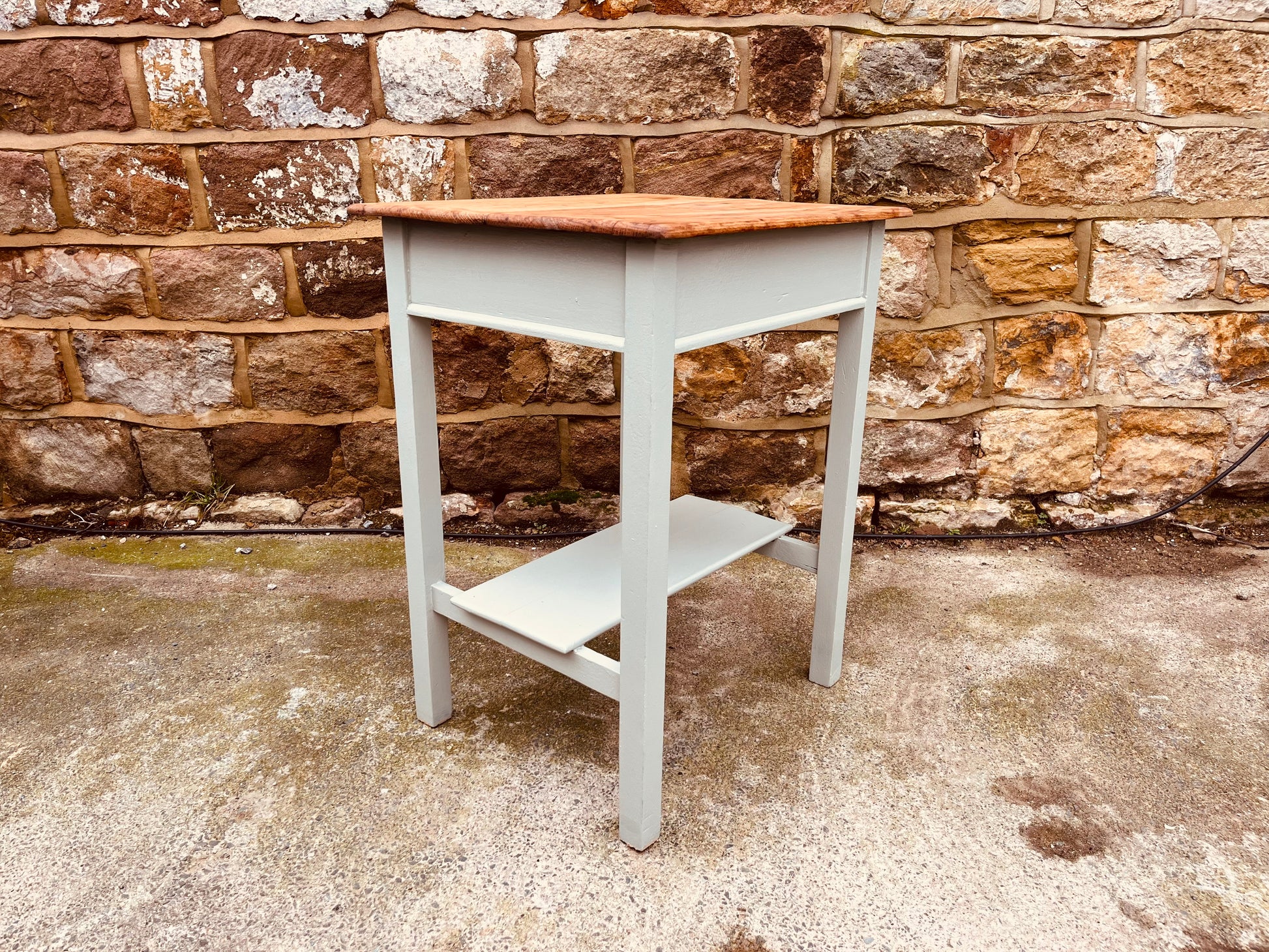 The solid wood top has been carefully sanded back to reveal the natural grain and sealed for durability, while the base has been hand-painted in a soft heritage green-grey. The result is a calm, understated piece that brings warmth and texture to any space. A practical lower shelf adds functionality, making this table ideal as a bedside table, lamp table or sofa side table.
