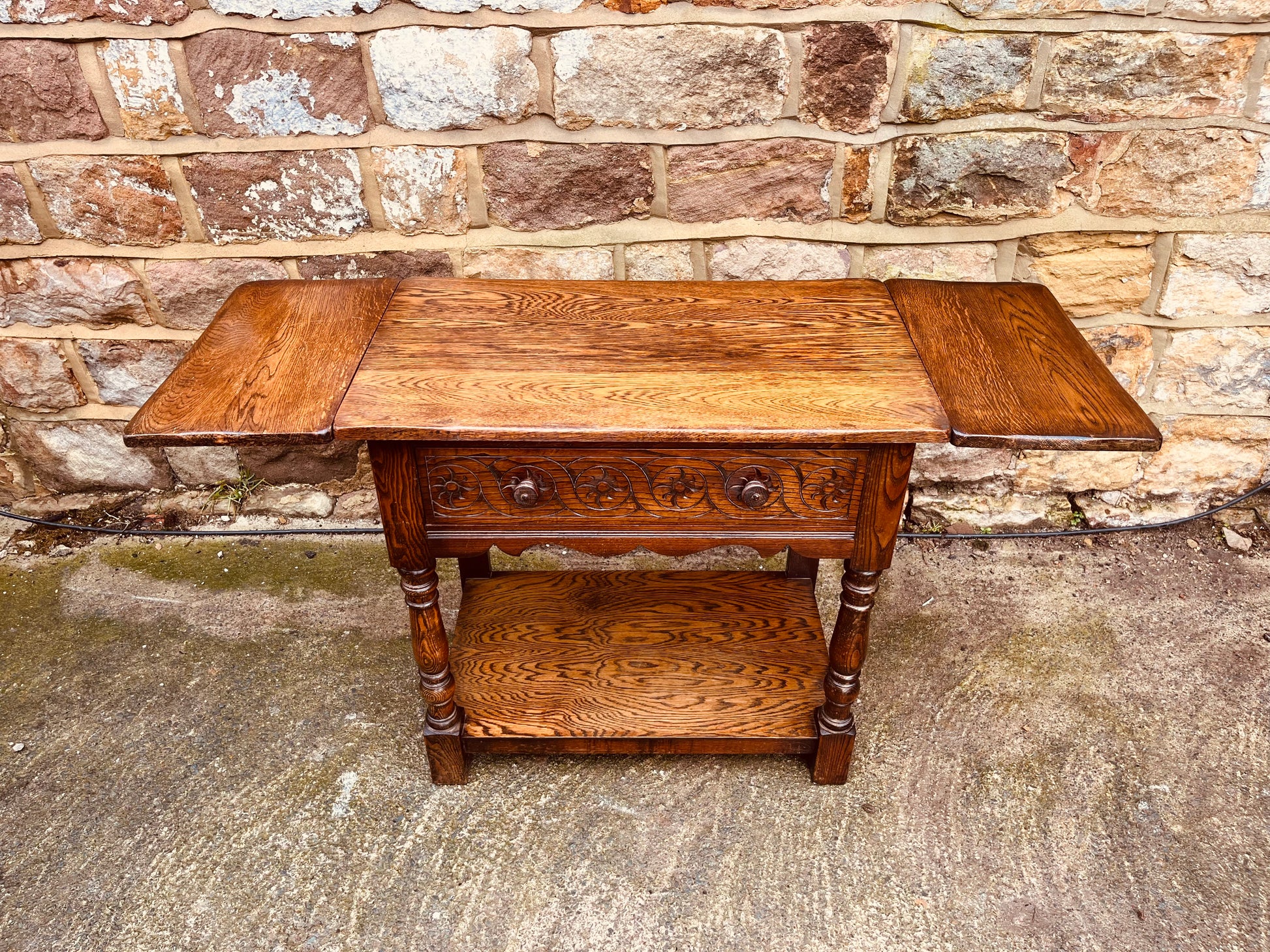 Vintage Solid Oak Drop-Leaf Side Table with Carved Detail & Lower Shelf