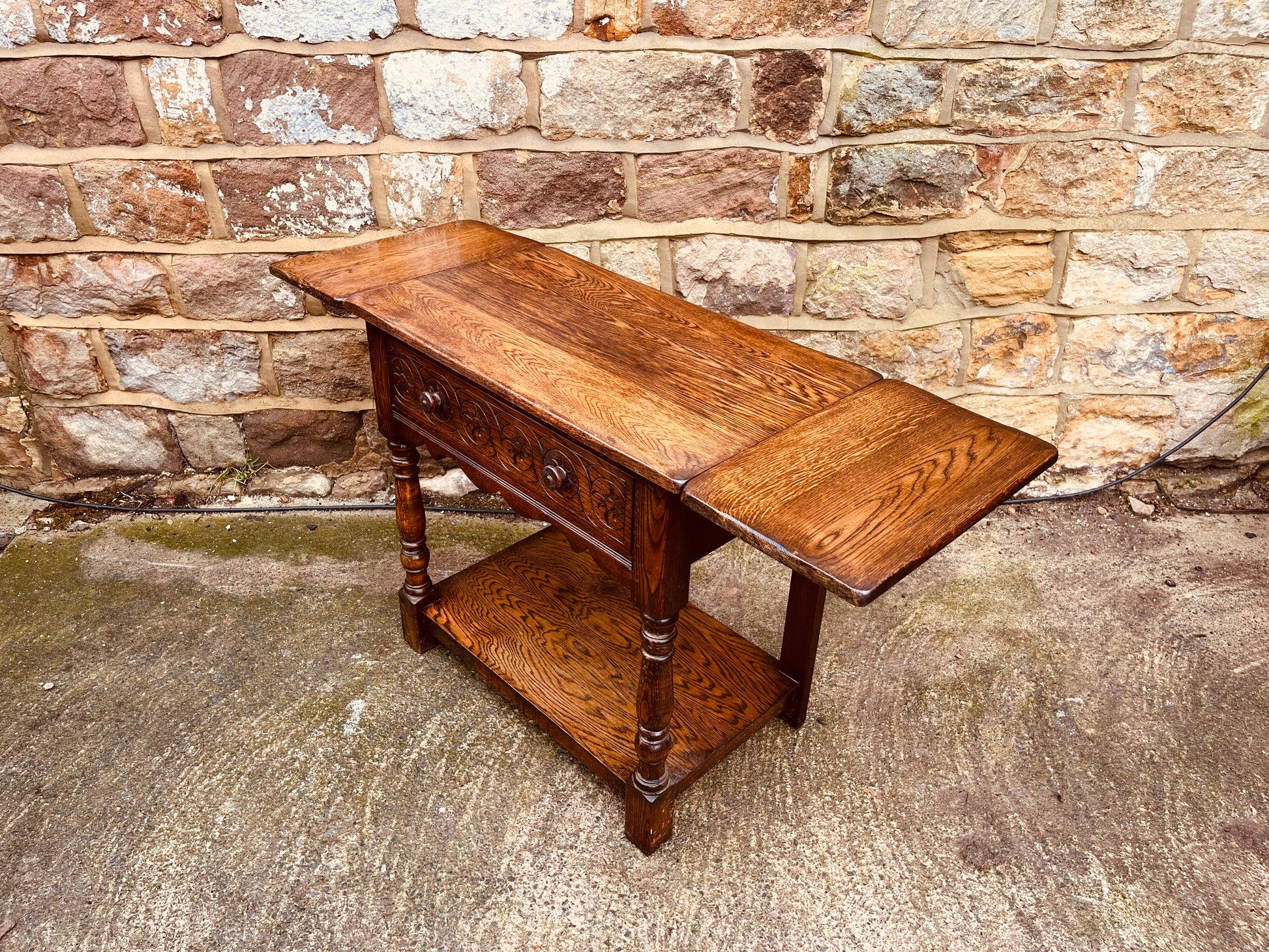 Made from solid oak, the table features an elegant decoratively carved front panel, turned legs, and a useful lower shelf. The drop-leaf design allows it to adapt effortlessly to its surroundings — expanding when needed and folding neatly away when space is at a premium.