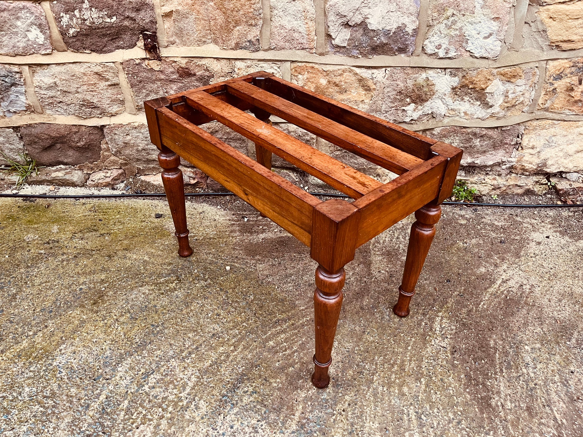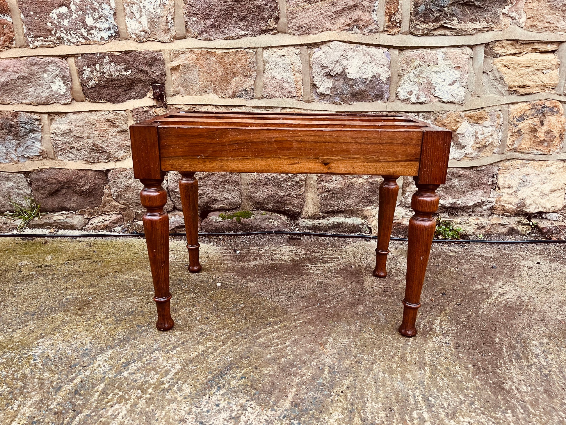 Give a second life to this vintage wooden footstool frame, complete with beautiful turned legs and rustic character. This is the perfect base for an upholstery or restoration project — ideal for beginners, hobby makers, or seasoned upcyclers looking for a unique reclaimed piece.