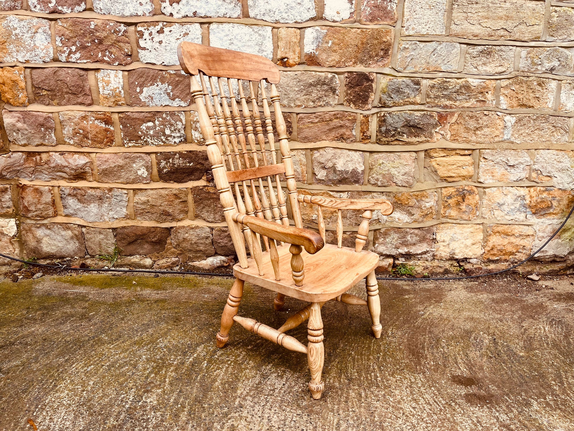 The chair has been carefully stripped back to reveal the natural grain of the wood, resulting in a clean, neutral finish that sits comfortably in both traditional and modern country interiors. Its elegant spindle-back form and sturdy construction make it an ideal statement piece for a farmhouse kitchen, dining space, hallway, or reading corner.